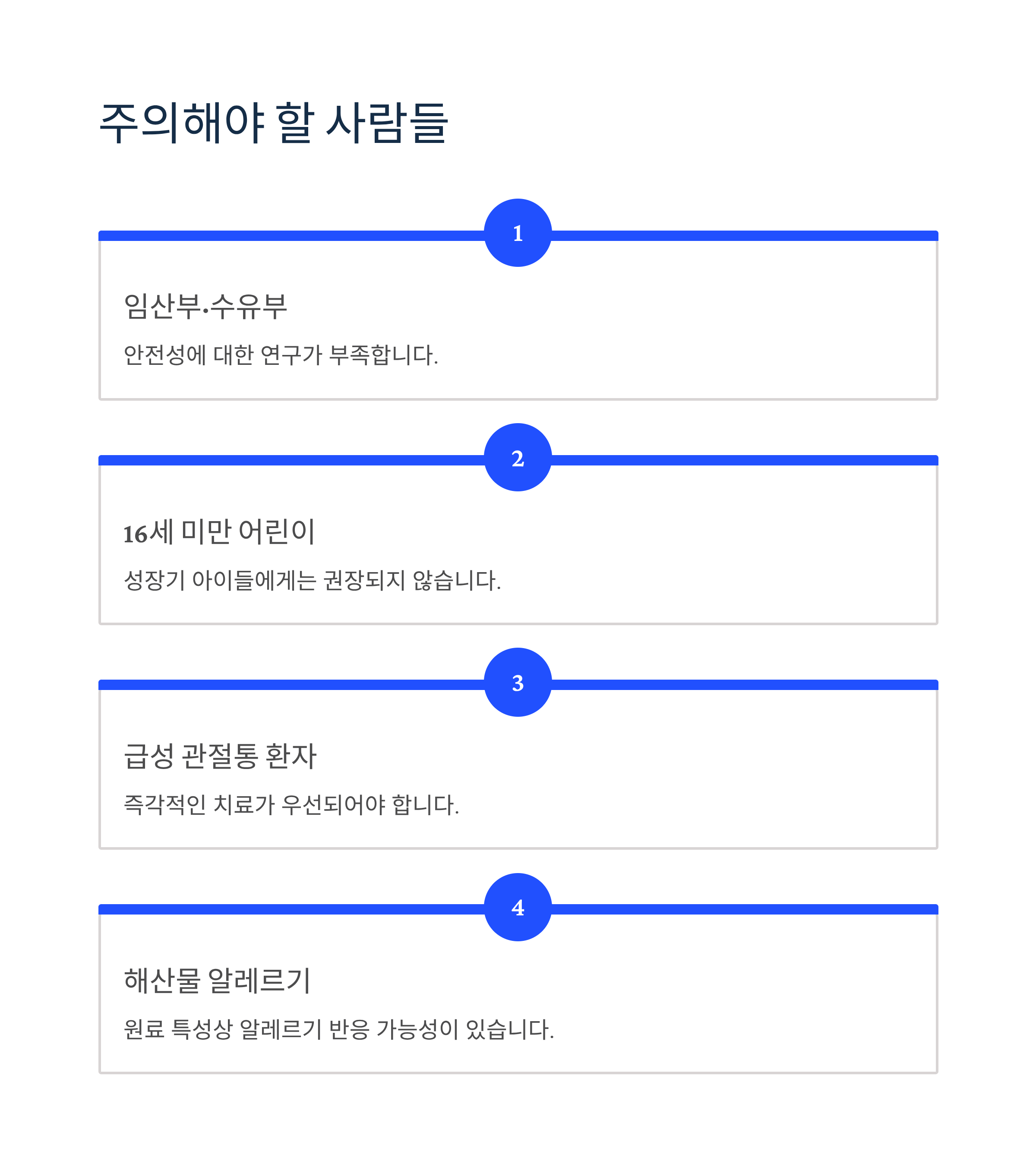 - 임산부 및 수유부 (안전성에 대한 연구 부족)
