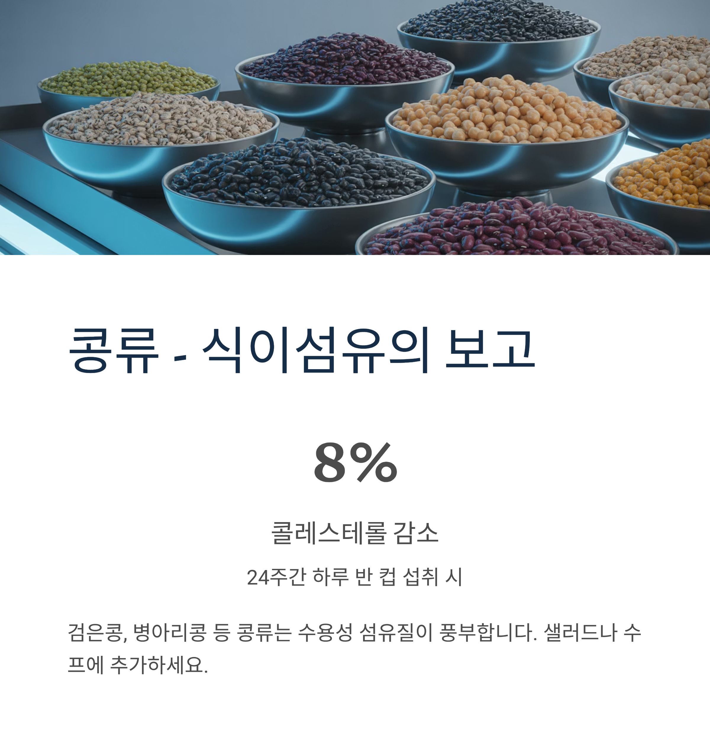 검은콩, 병아리콩 등 콩류는 수용성 섬유질이 풍부해 24주간 하루 반 컵 섭취 시 콜레스테롤이 8% 감소한다는 연구 결과가 있습니다.