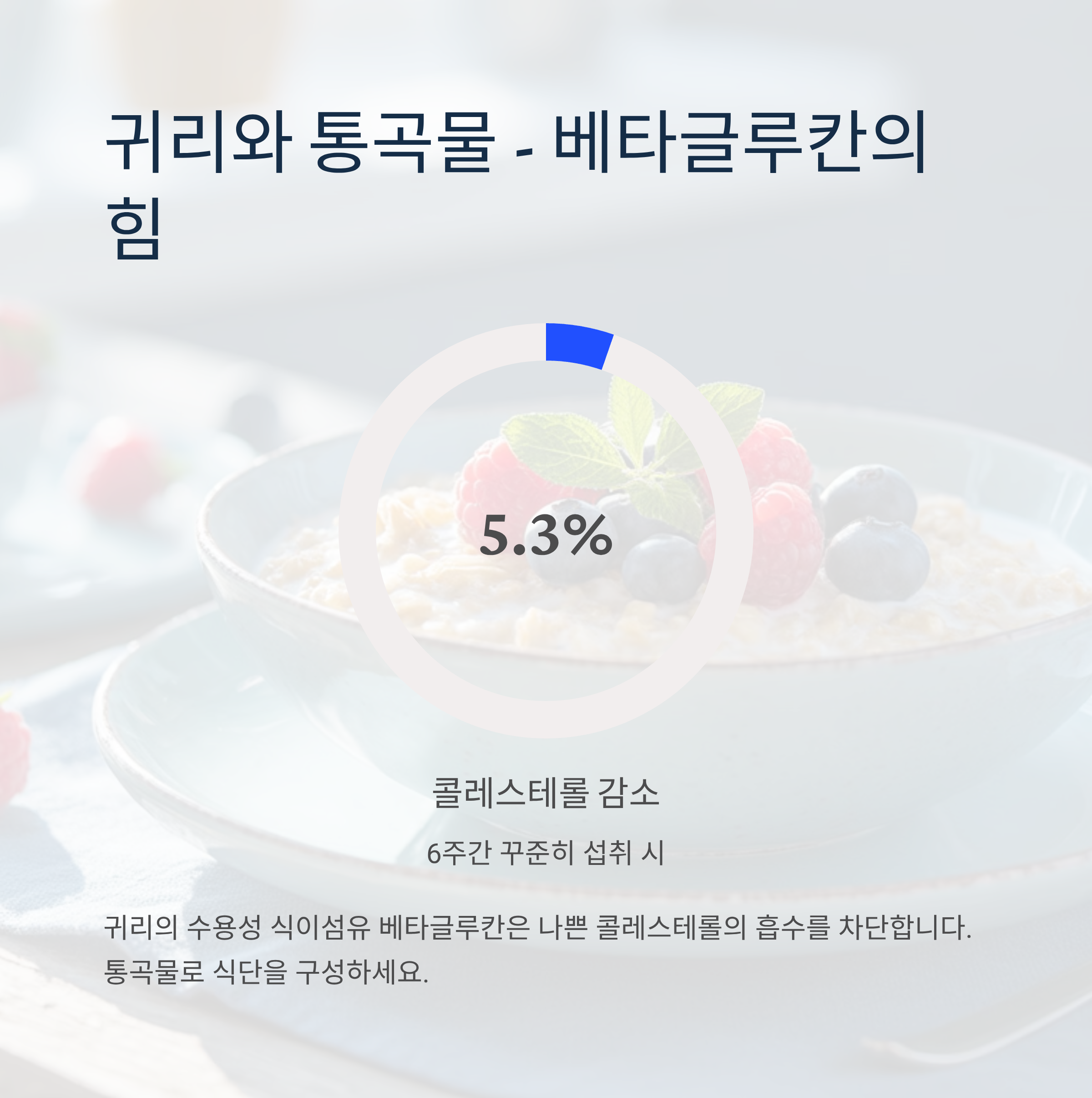 귀리에 함유된 수용성 식이섬유 베타글루칸은 나쁜 콜레스테롤의 흡수를 차단합니다. 연구에 따르면 6주간 꾸준히 섭취 시 콜레스테롤 수치가 5.3% 감소했습니다.