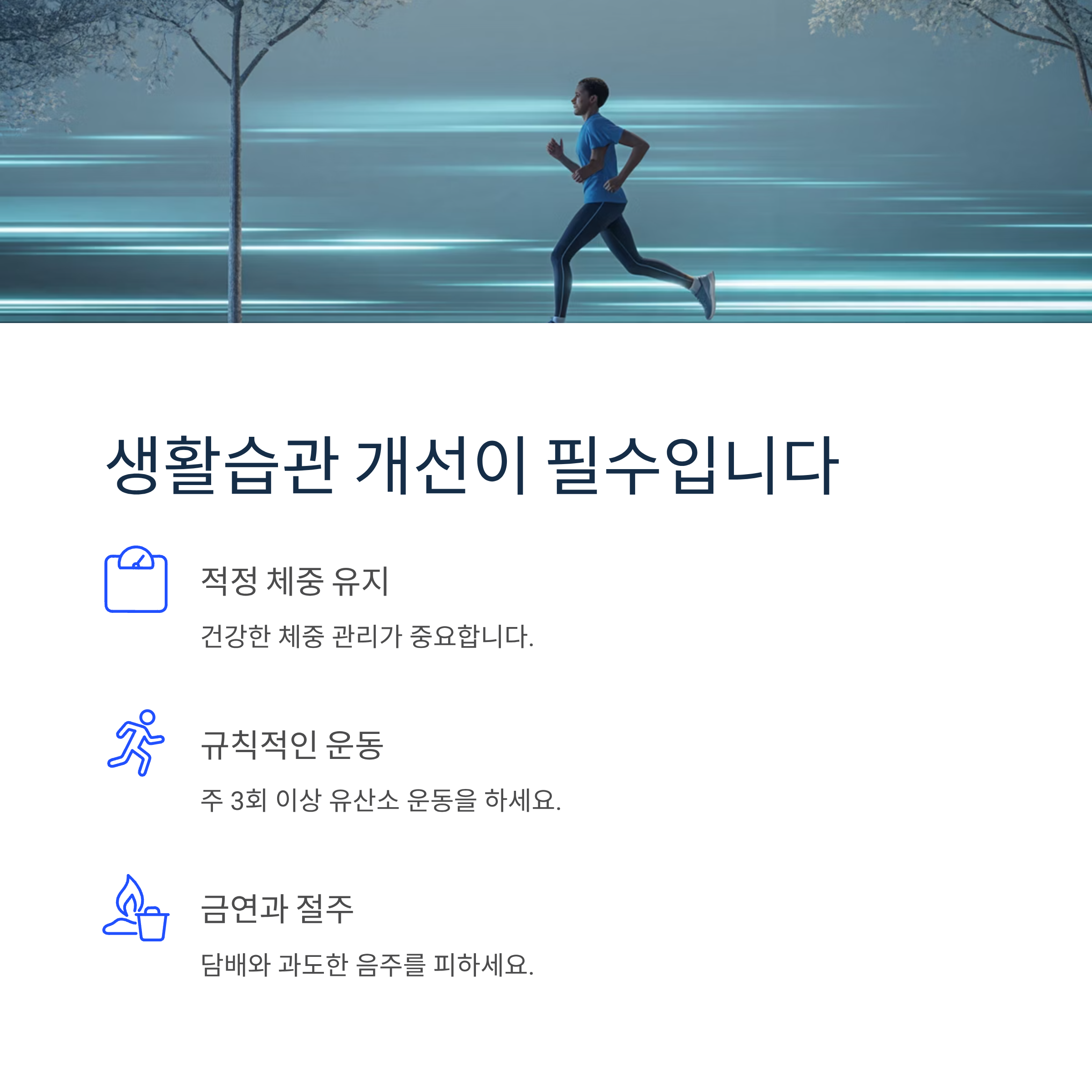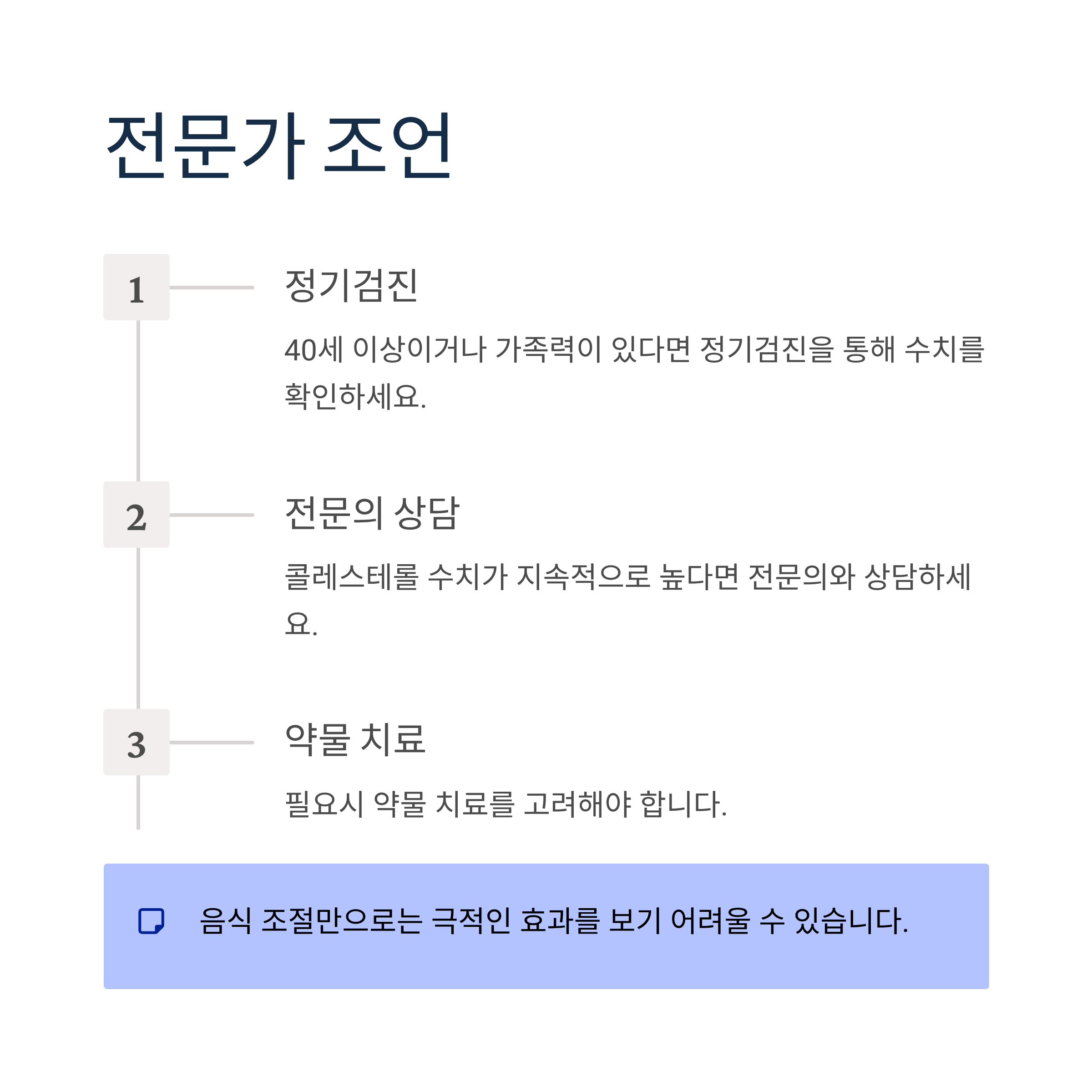 음식 조절만으로는 극적인 효과를 보기 어려울 수 있습니다. 적정 체중 유지, 규칙적인 운동, 금연과 절주를 함께 실천하고, 40세 이상이거나 가족력이 있다면 정기검진을 통해 수치를 확인하세요. 콜레스테롤 수치가 지속적으로 높다면 전문의와 상담 후 약물 치료를 고려해야 합니다.