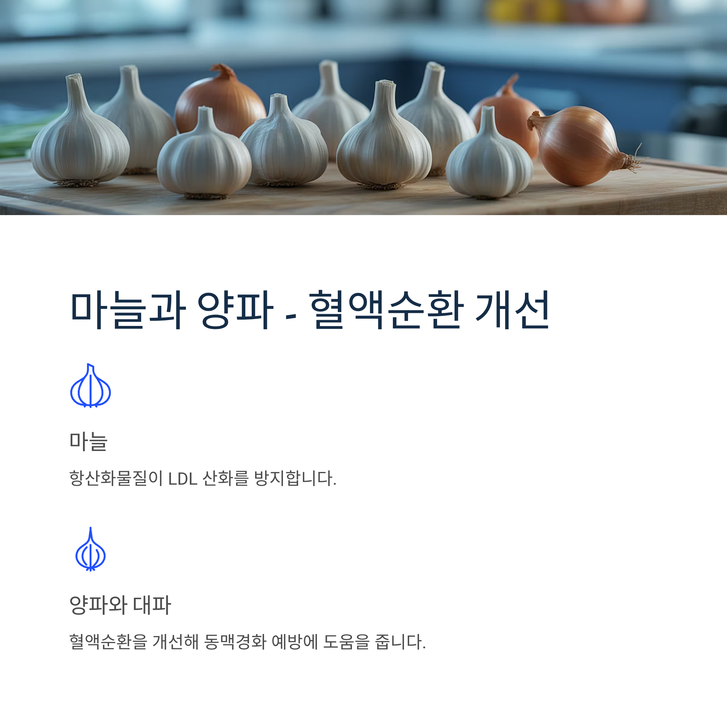 마늘의 항산화물질은 LDL 산화를 방지하고, 양파와 대파는 혈액순환을 개선해 동맥경화 예방에 도움을 줍니다.