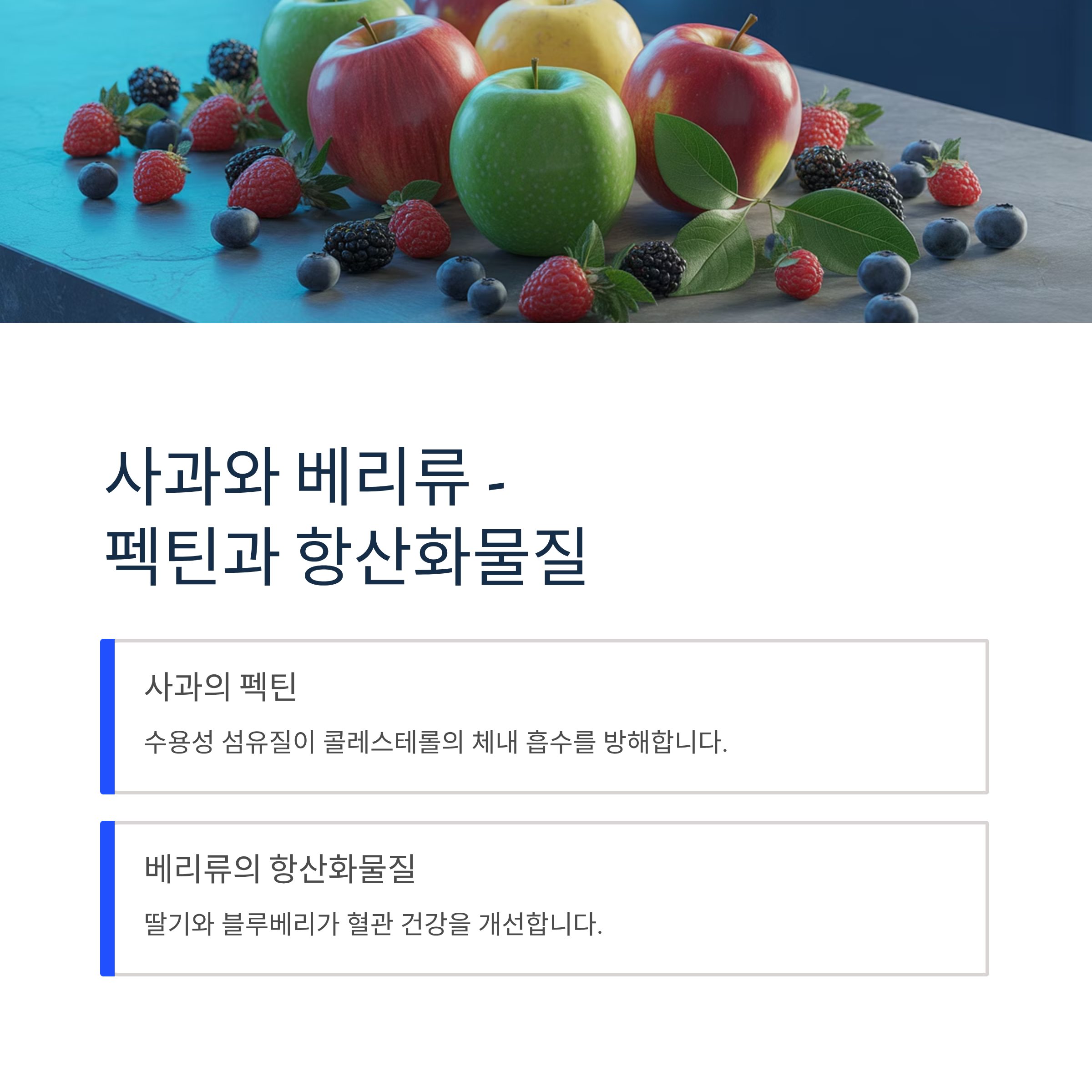 사과의 수용성 섬유질 펙틴은 콜레스테롤의 체내 흡수를 방해하고, 딸기와 블루베리의 항산화물질은 혈관 건강을 개선합니다.