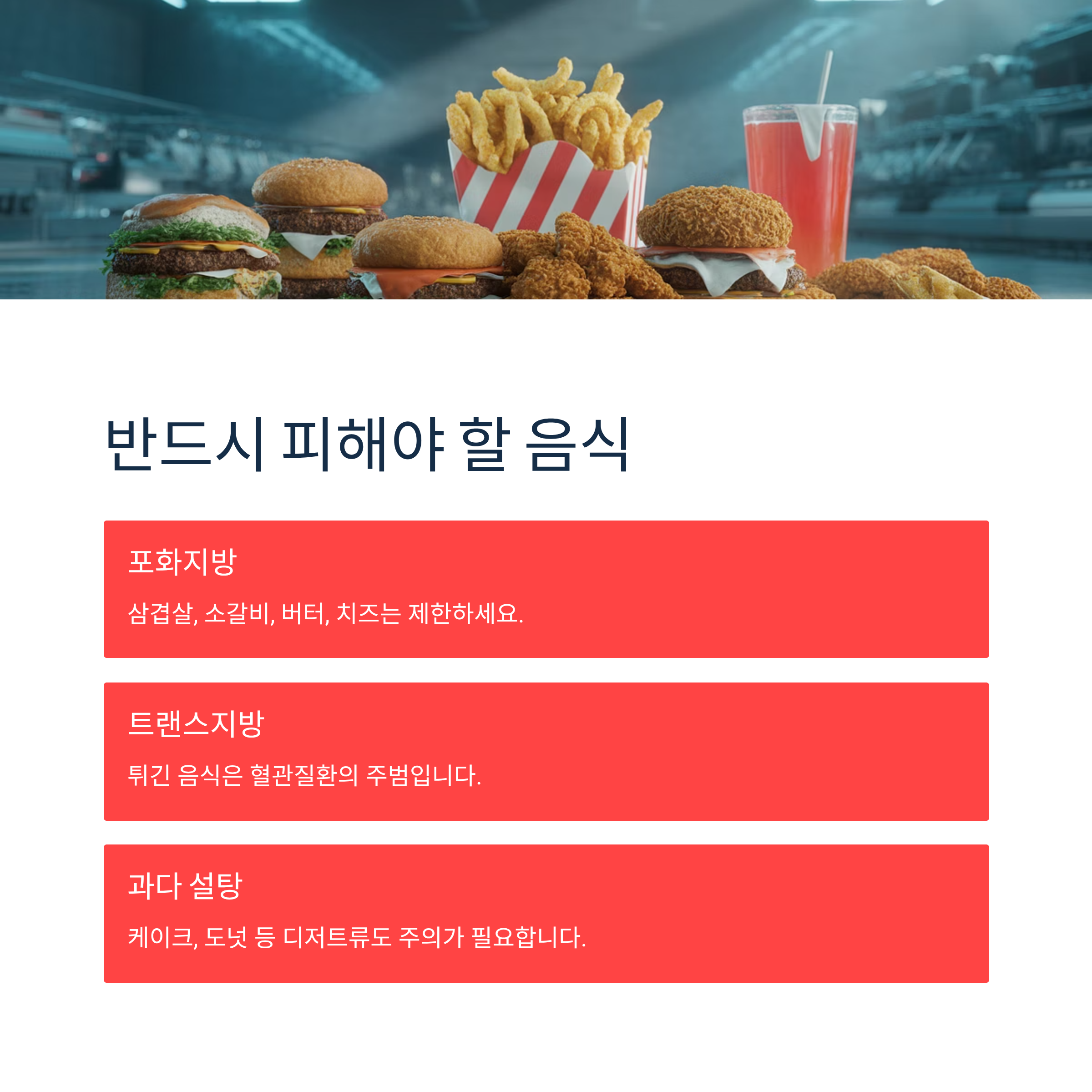 포화지방이 많은 삼겹살, 소갈비, 버터, 치즈는 제한하세요. 튀긴 음식의 트랜스지방산은 혈관질환의 주범입니다. 또한 케이크, 도넛 등 설탕과 지방이 과다한 디저트류도 주의가 필요합니다.