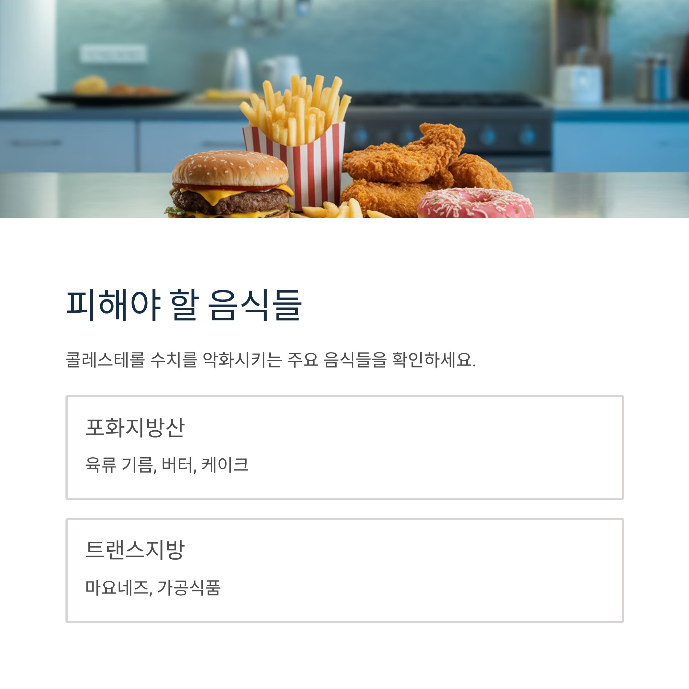 - 트랜스 지방산이 함유량이 많은 음식은 콜레스테롤 수치를 악화시킵니다
