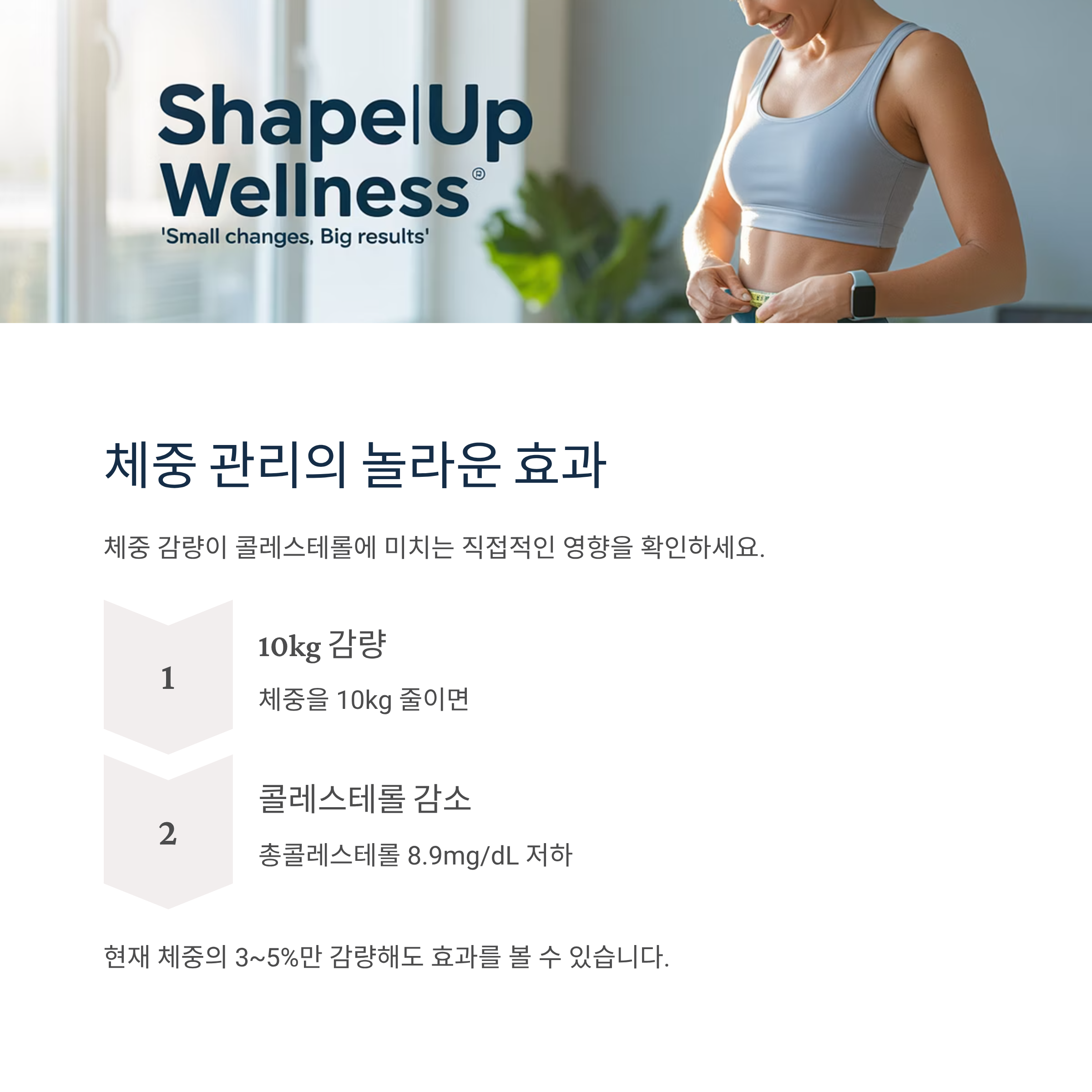 체중 감량이 어렵다면 1차 감량 목표를 현재 체중의 3~5% 선으로 정하는 것이 좋습니다. 이렇게만 감량을 해도 혈중 콜레스테롤과 중성지방 수치가 개선되는 효과를 기대할 수 있습니다.