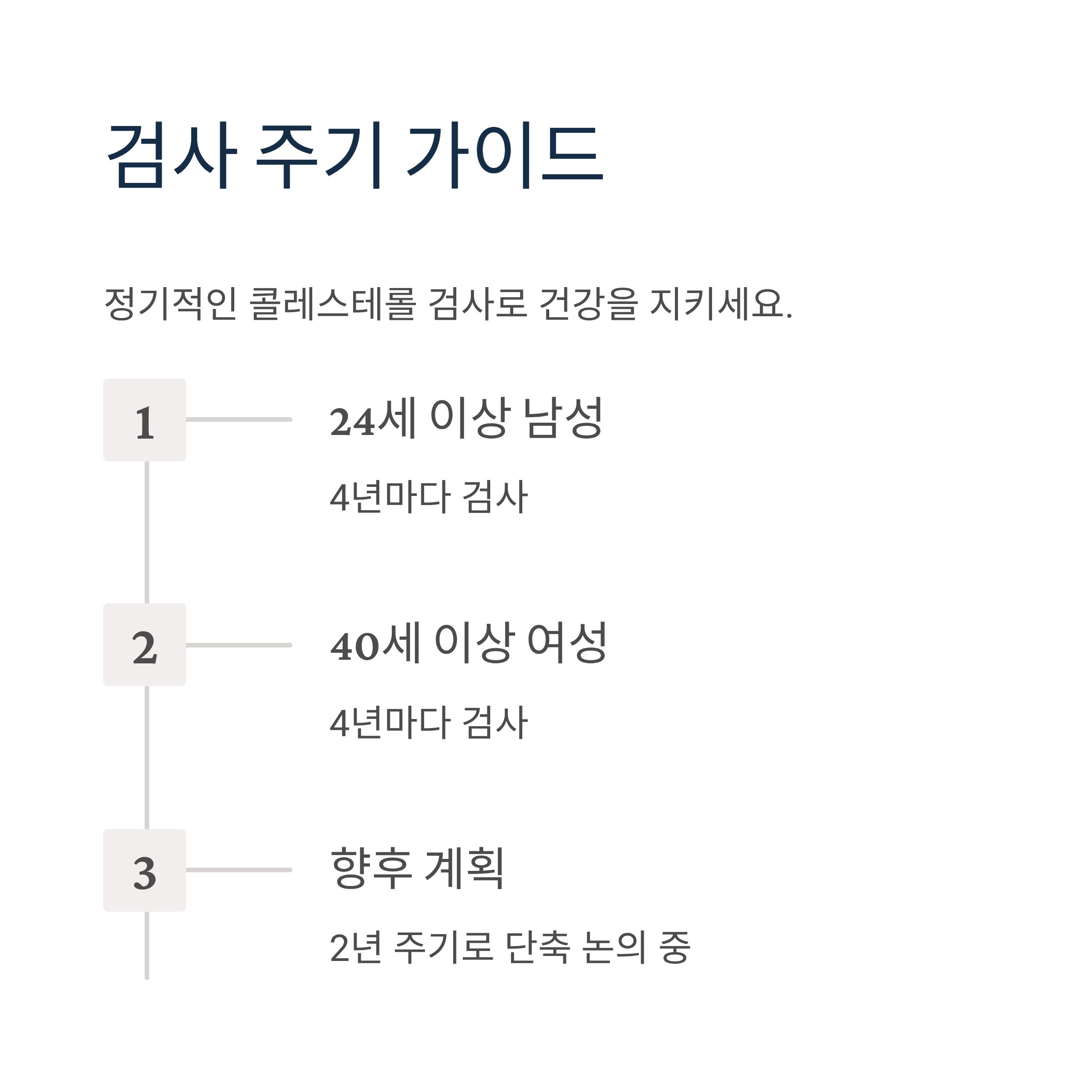 24세 이상 남성, 40세 이상 여성은 4년마다 콜레스테롤 혈액검사를 받아야 합니다. 하지만 최근에는 현행 4년에서 2년으로의 검진 주기 단축에 대한 논의가 활발히 진행되고 있습니다.