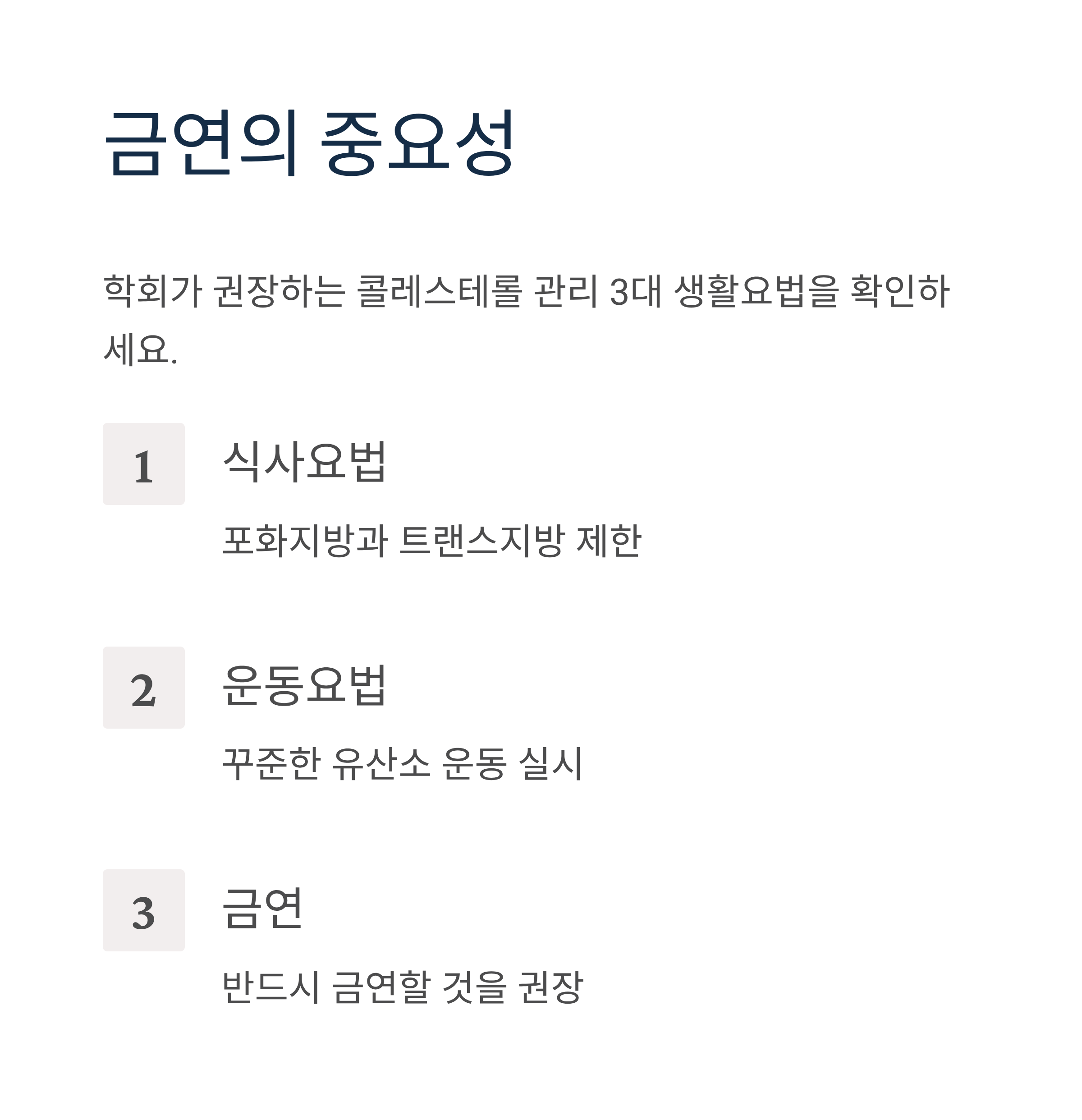학회는 콜레스테롤 수치를 조절하기 위한 생활요법 3가지로 식사요법, 운동요법과 함께 반드시 금연할 것을 권장합니다.