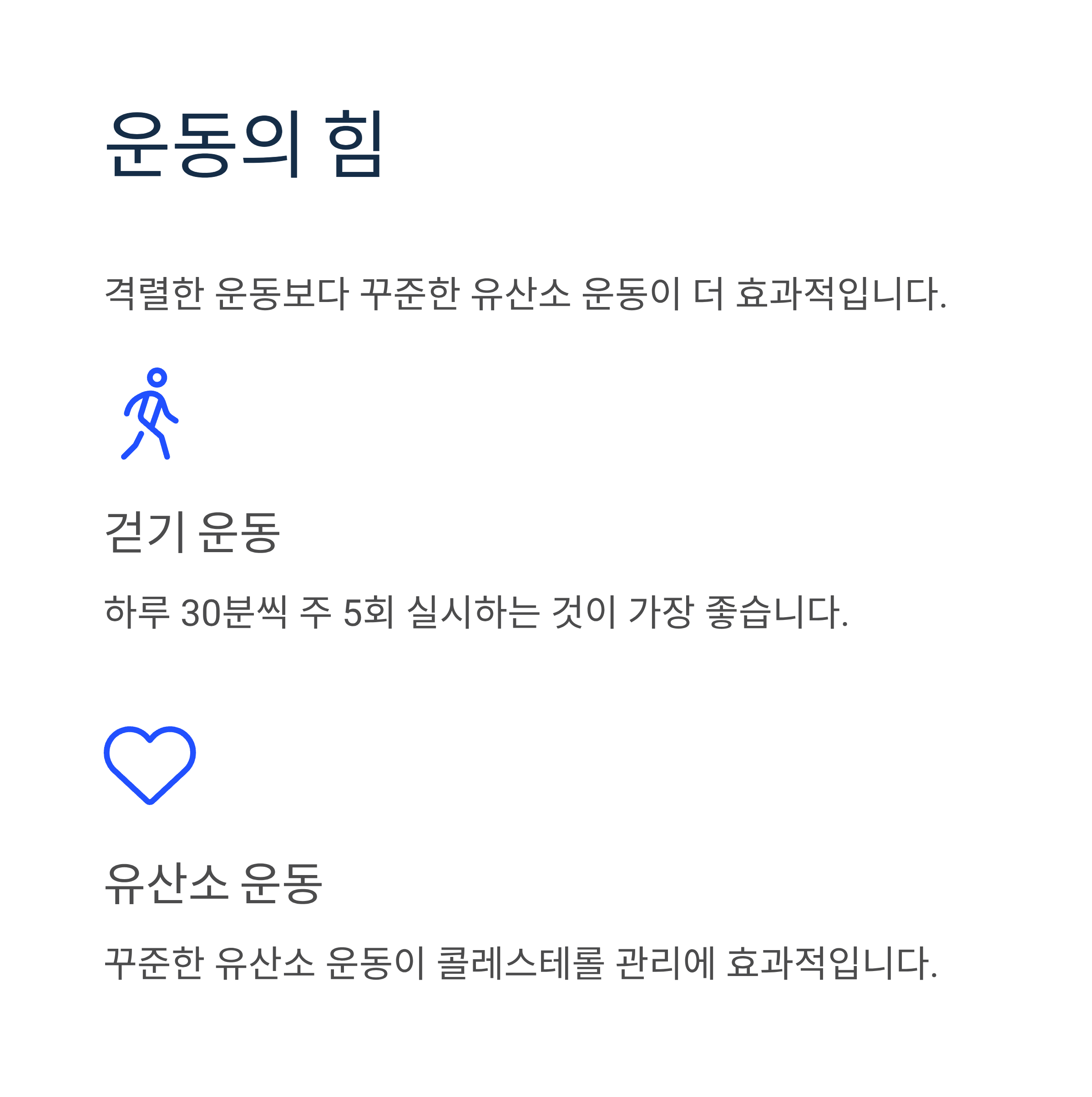 걷기와 같은 가벼운 유산소운동을 하루 30분씩 주 5회 하는 것이 좋습니다. 격렬한 운동보다는 꾸준한 유산소 운동이 콜레스테롤 관리에 더 효과적입니다.