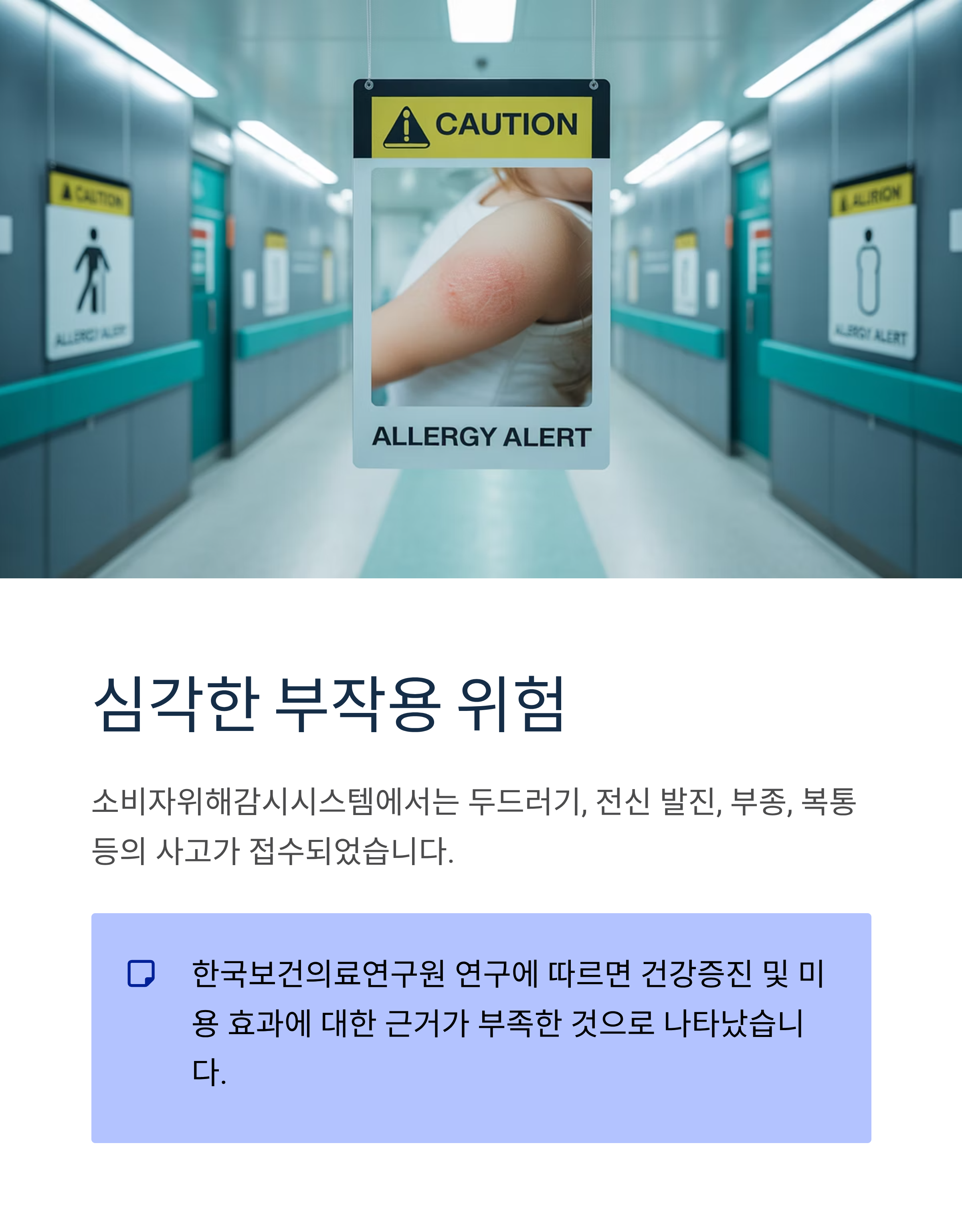 태반주사의 경우 소비자위해감시시스템에서는 두드러기, 전신 발진, 부종, 복통 등의 사고가 접수됐습니다. 한국보건의료연구원의 연구에 따르면 태반주사는 건강증진 효과 및 미용 증진 효과에 대한 근거가 부족한 것으로 나타났습니다.