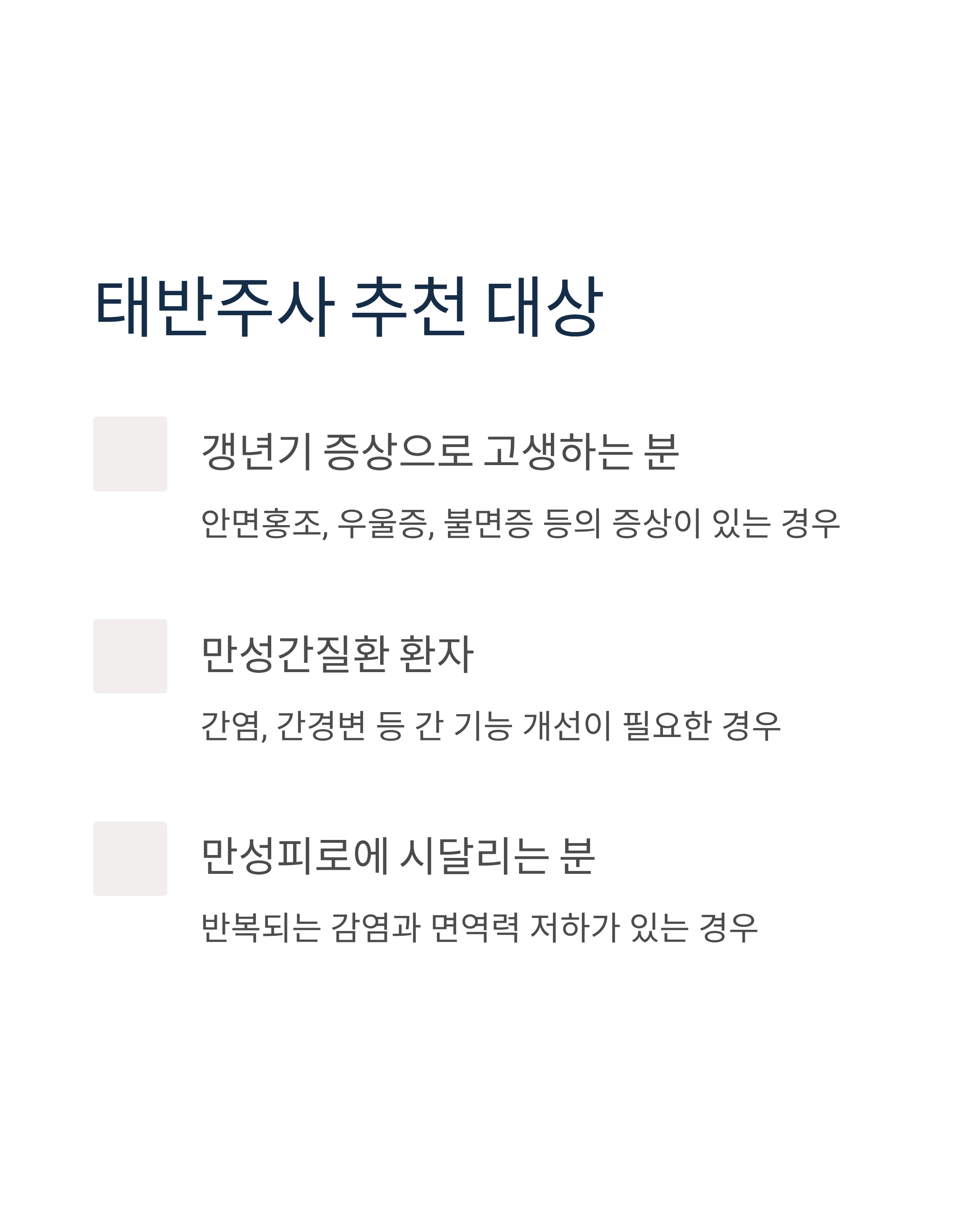 태반주사는 주로 면역체계가 약한 환자들에게 추천됩니다. 특히 만성적인 피로, 반복되는 감염 증상을 겪는 환자, 혹은 면역 억제제를 사용하고 있는 환자들이 태반주사의 대상으로 고려될 수 있습니다.