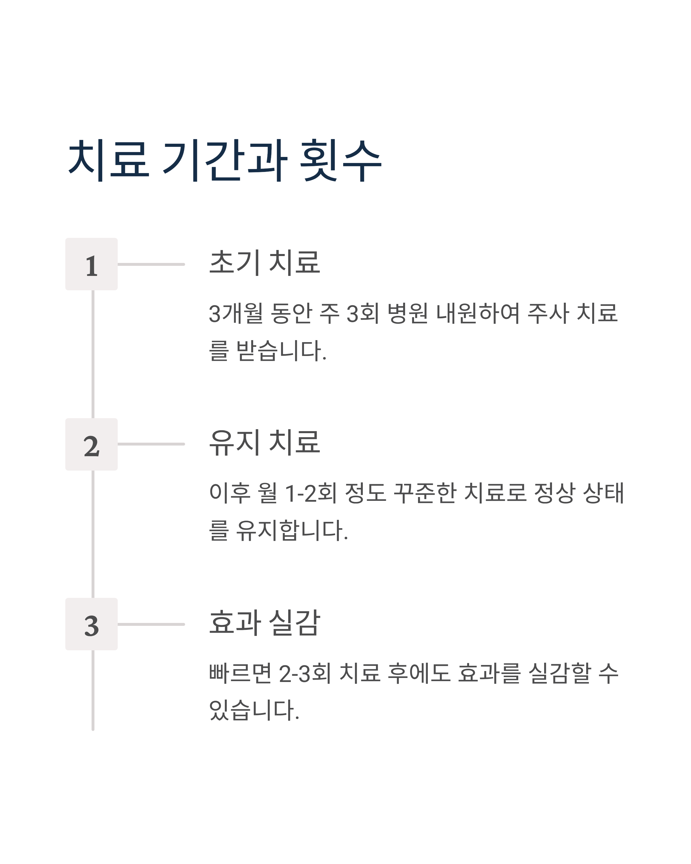초기 치료과정은 3개월 동안 시행되며 주 3회 병원에 내원해 주사를 맞게 됩니다. 환자 상태에 따라서 피하주사, 근육주사, 혈관주사를 선택하게 됩니다.