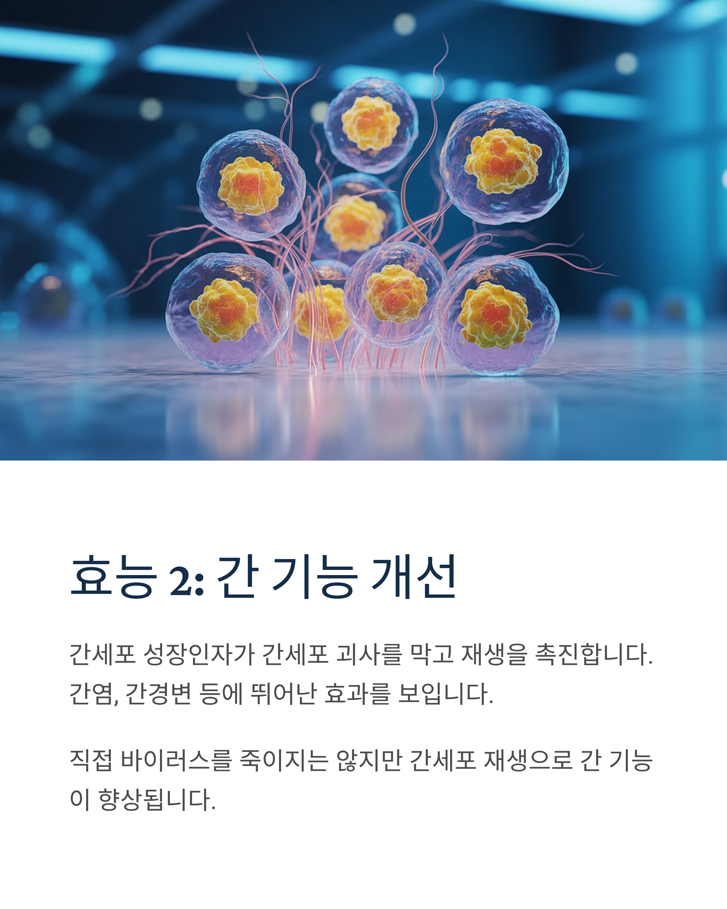 간세포 성장인자가 들어 있어 간세포 뿐 아니라, 거의 모든 장기 세포의 괴사를 막고 간세포를 회복·재생시킵니다. 태반제재는 직접 바이러스를 죽이는 작용을 하지 않지만, 간세포의 재생으로 간 기능이 향상돼 간염, 간경변 등에 뛰어난 효과를 보입니다.