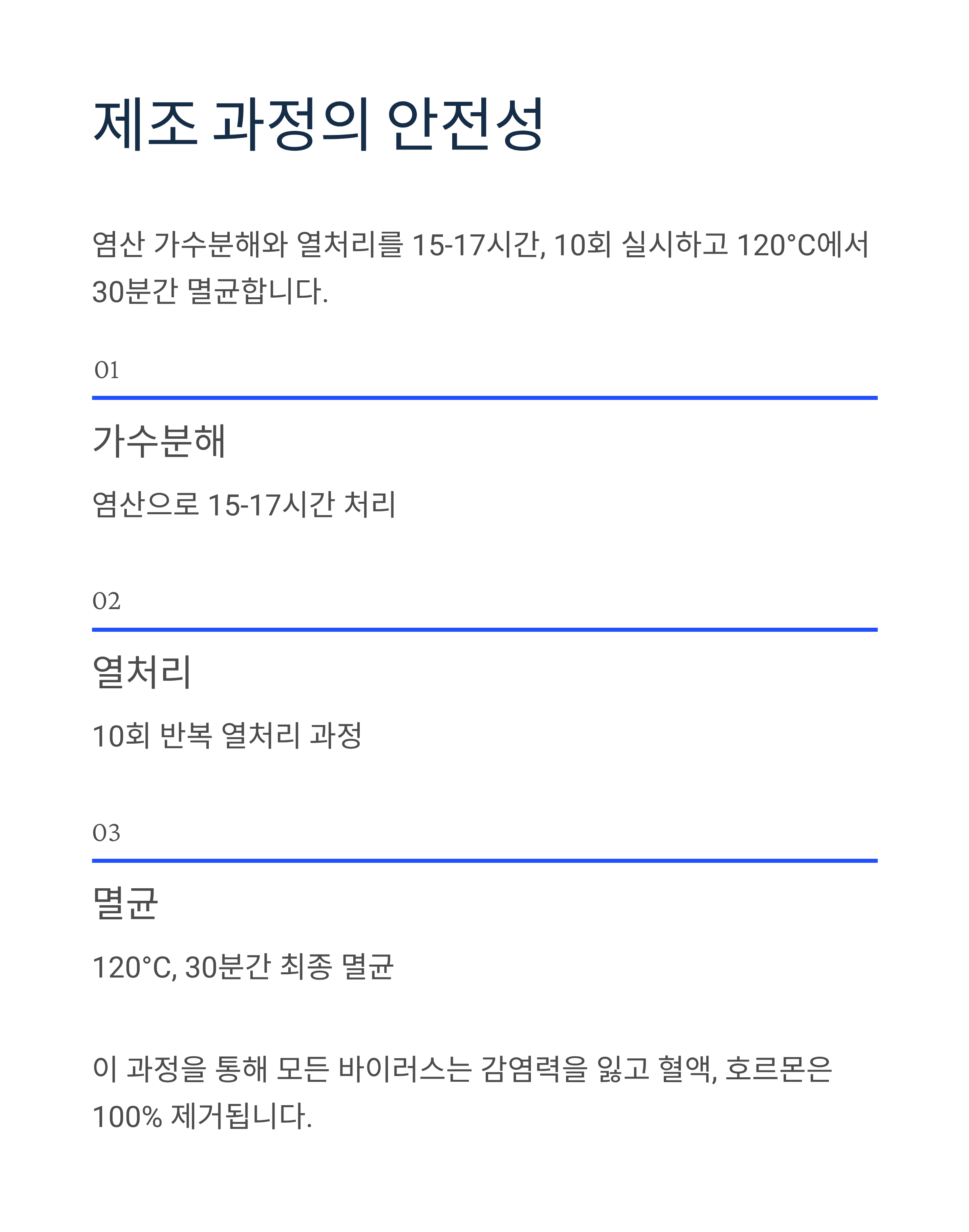 태반의 제조 과정은 염산에 의한 가수분해와 열처리를 15~17시간, 10회 행하고 자동 고압멸균 소독기로 120°C, 30분간 멸균함으로써 최종 멸균과정을 거친다. 이상의 공정과정을 통해 모든 바이러스는 감염력을 잃게 되고, 혈액이나 호르몬은 100% 제거됩니다.