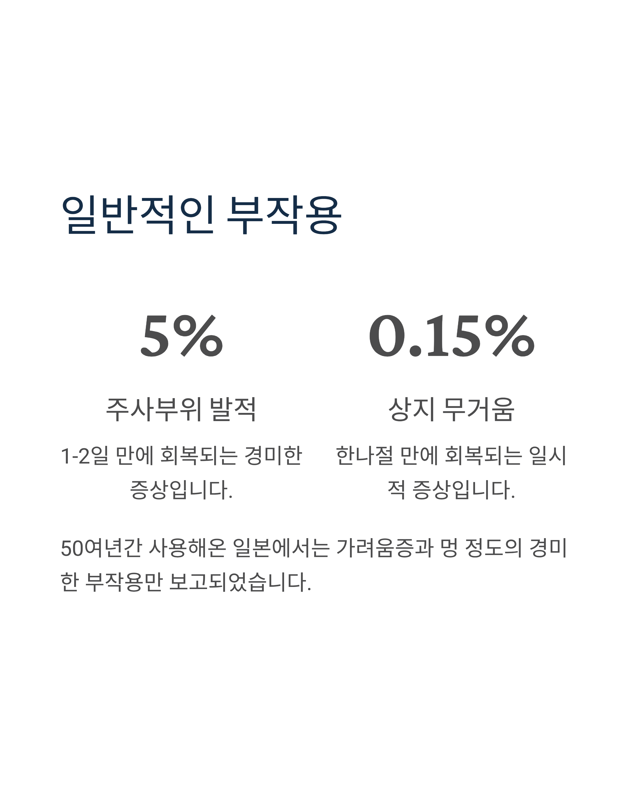 조사 증례 중 약5%가 주사부위의 발적 및 통증(1~2일만에 회복), 조사증례 중 약0.1~5% 주사 후 상지의 무거운 느낌(한나절 만에 회복), 아주 드물게 구역질 및 전신권태감(한나절 만에 회복), 이 외에서도 경미한 부작용은 몇 가지 있으나, 모두 바로 회복됐습니다.