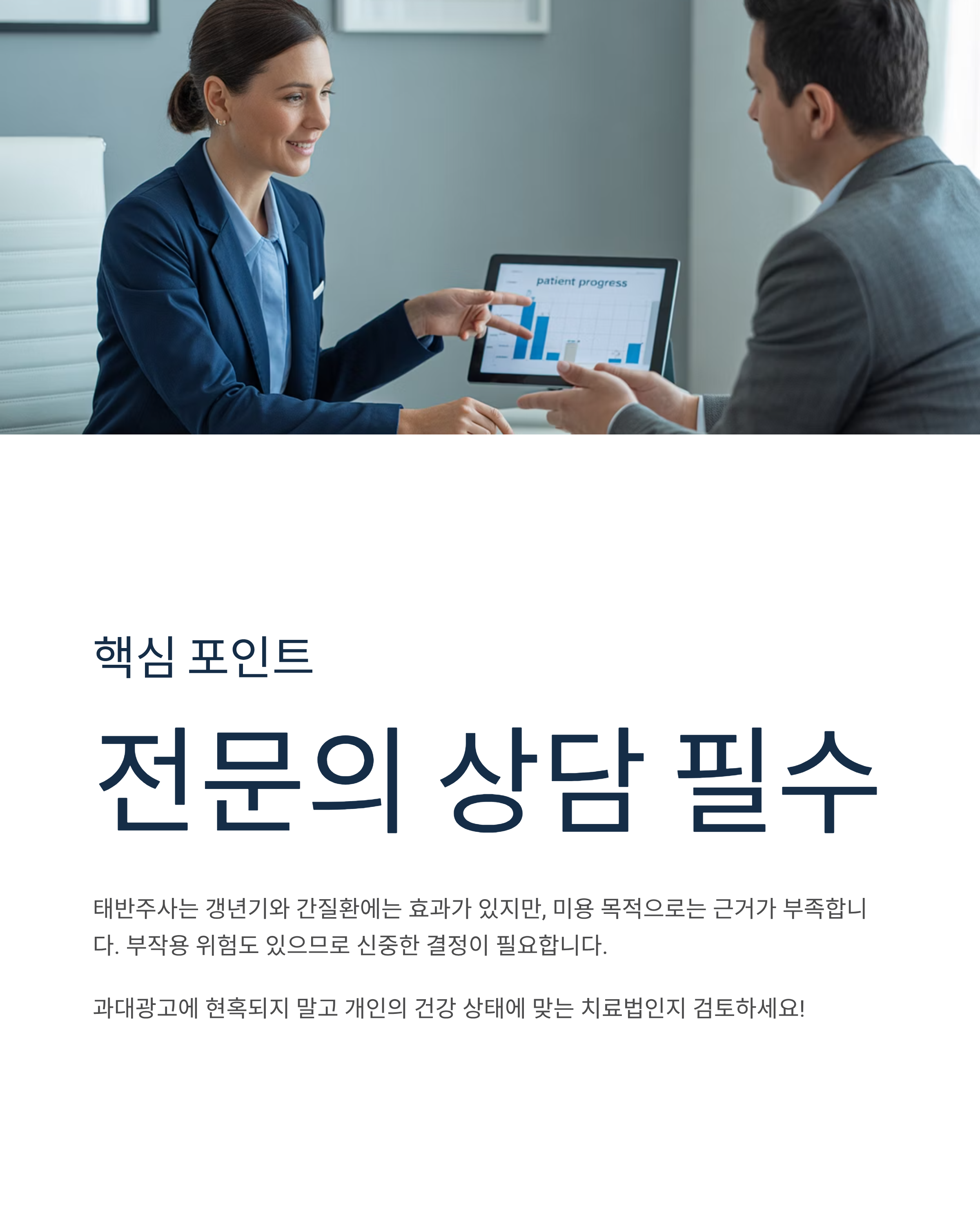 핵심 포인트: 태반주사는 갱년기와 간질환에는 효과가 있지만, 미용 목적으로는 근거가 부족하며 부작용 위험도 있으므로 전문의와의 상담이 필수입니다.