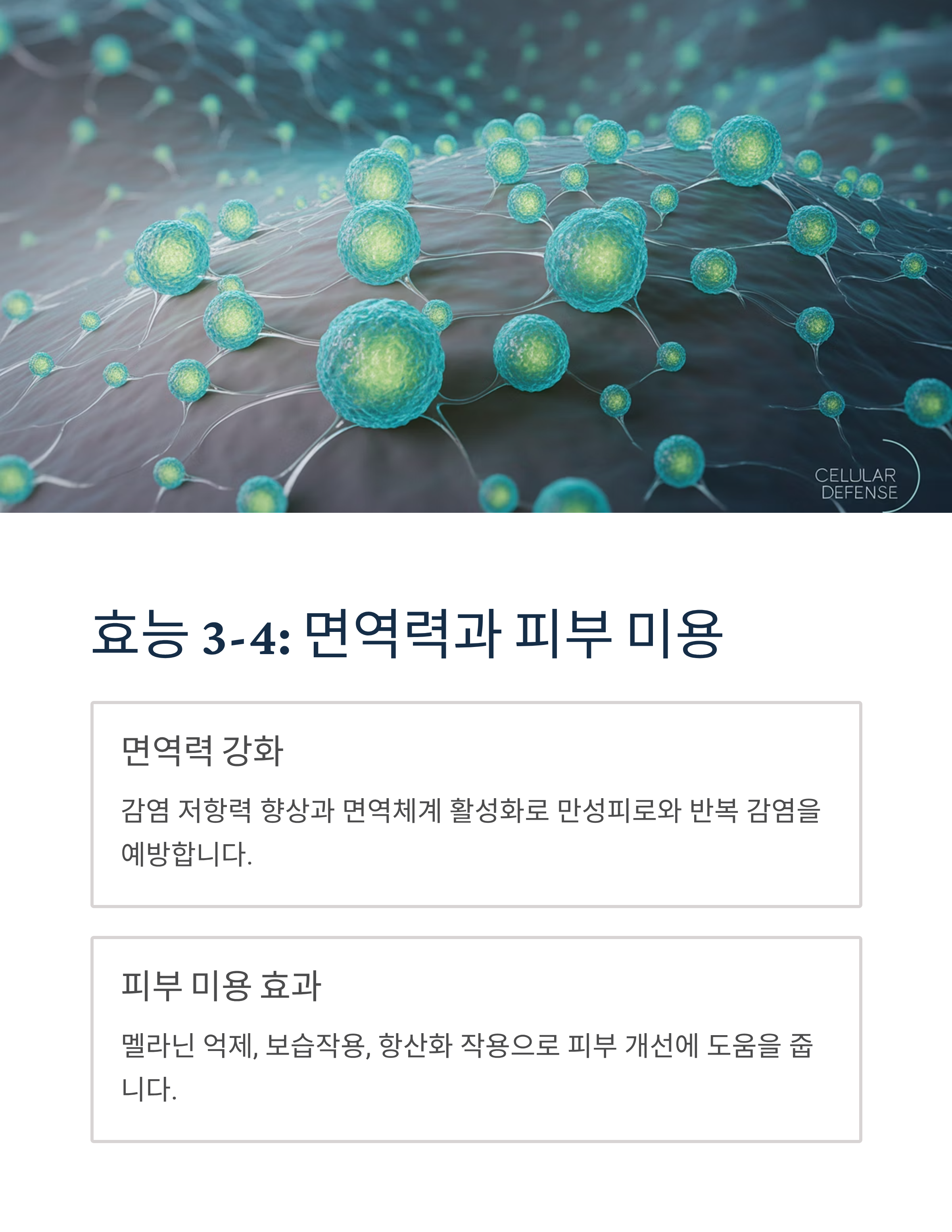 태반액에 함유된 성분들은 감염에 대한 저항력을 향상시키고, 면역체계를 효과적으로 활성화하는데 도움을 줍니다. 만성적인 피로, 반복되는 감염 증상을 겪는 환자들에게 특히 효과적입니다.
