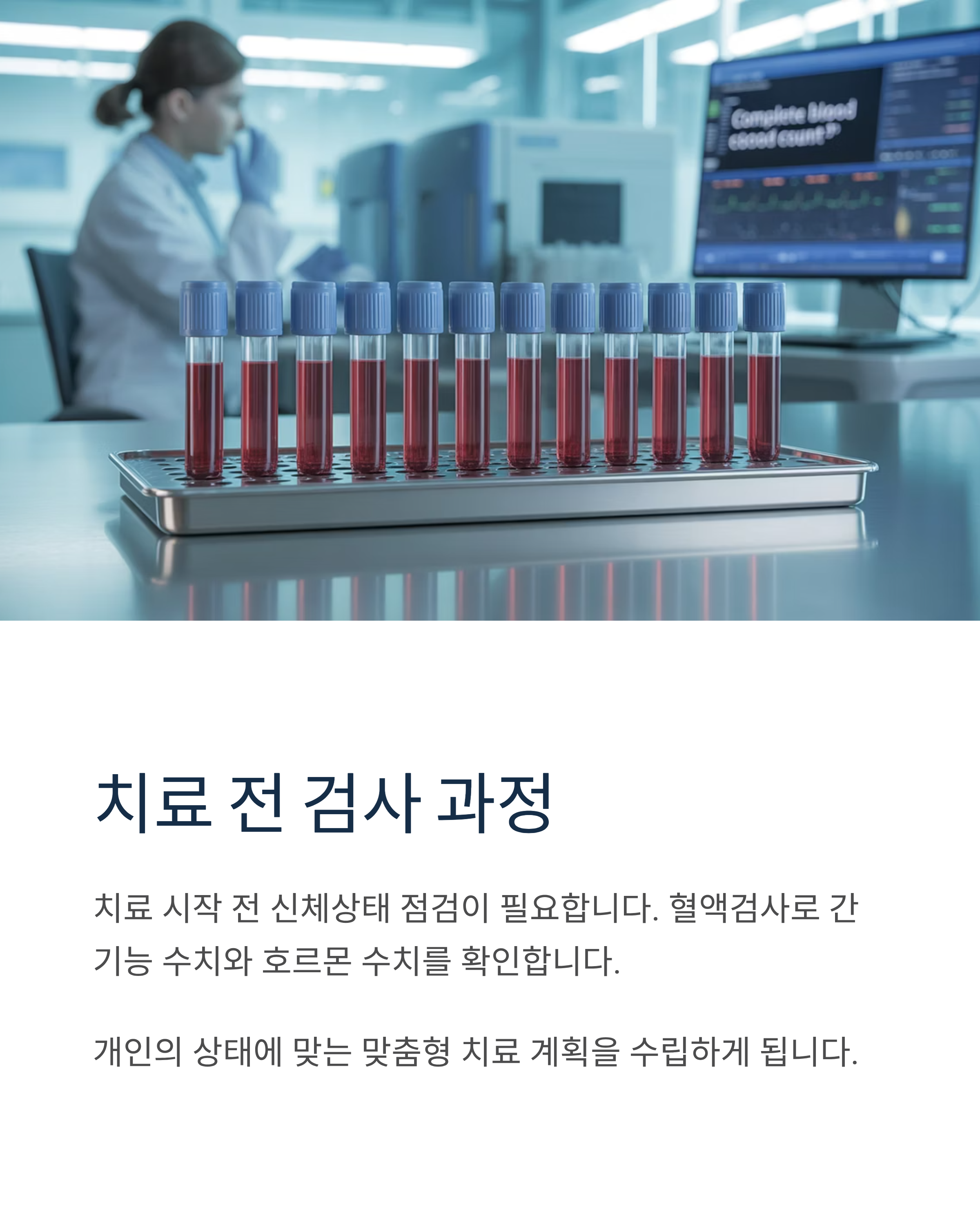 치료에 들어가기 전 신체상태를 점검하는 과정이 필요합니다. 간 기능 수치, 호르몬 수치 등을 혈액검사로 확인합니다.