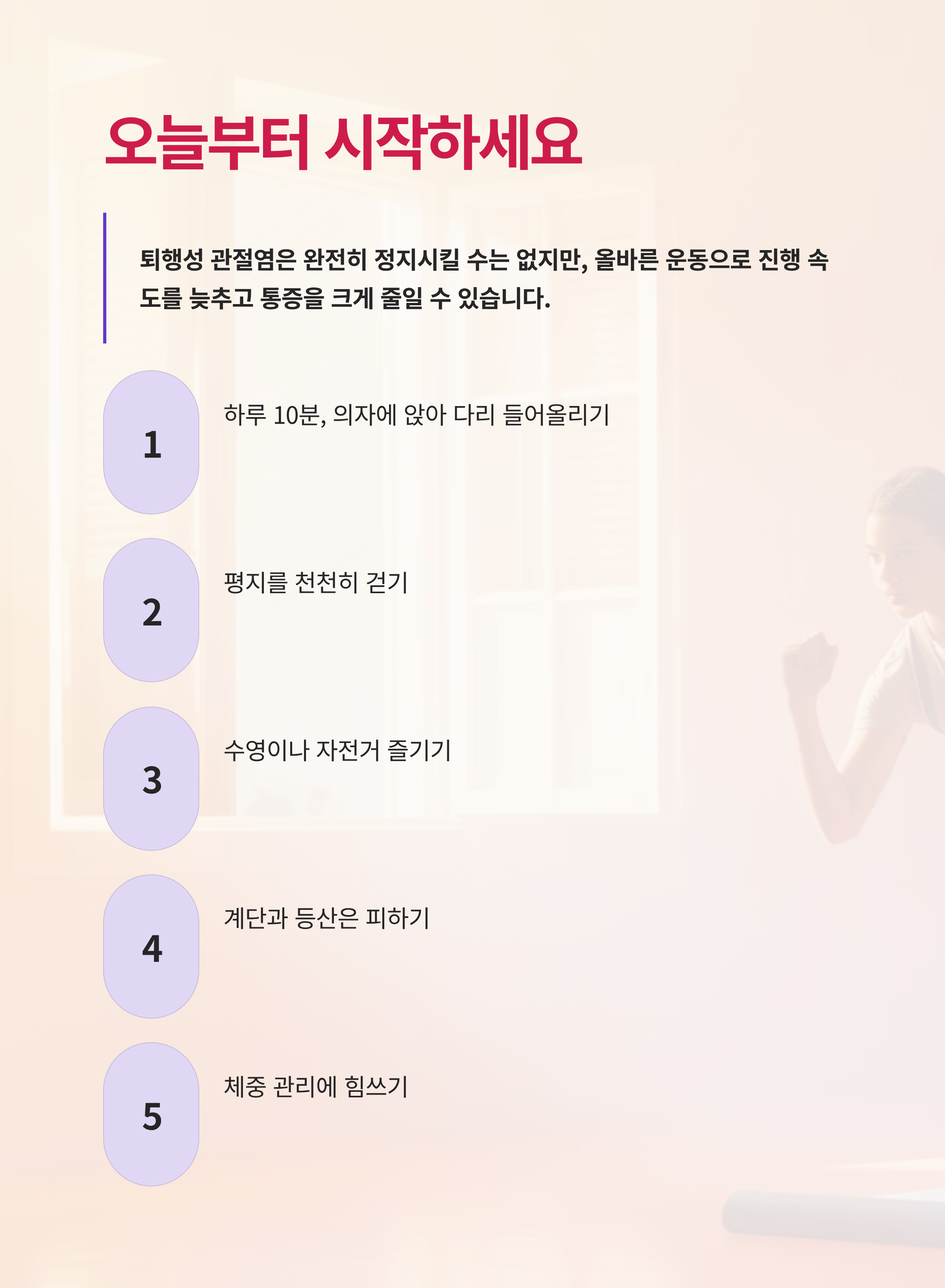퇴행성 관절염은 완전히 정지시킬 수는 없지만, 올바른 운동으로 진행 속도를 늦추고 통증을 크게 줄일 수 있습니다. 무릎을 아낀다고 움직이지 않는 것은 최악의 선택입니다.