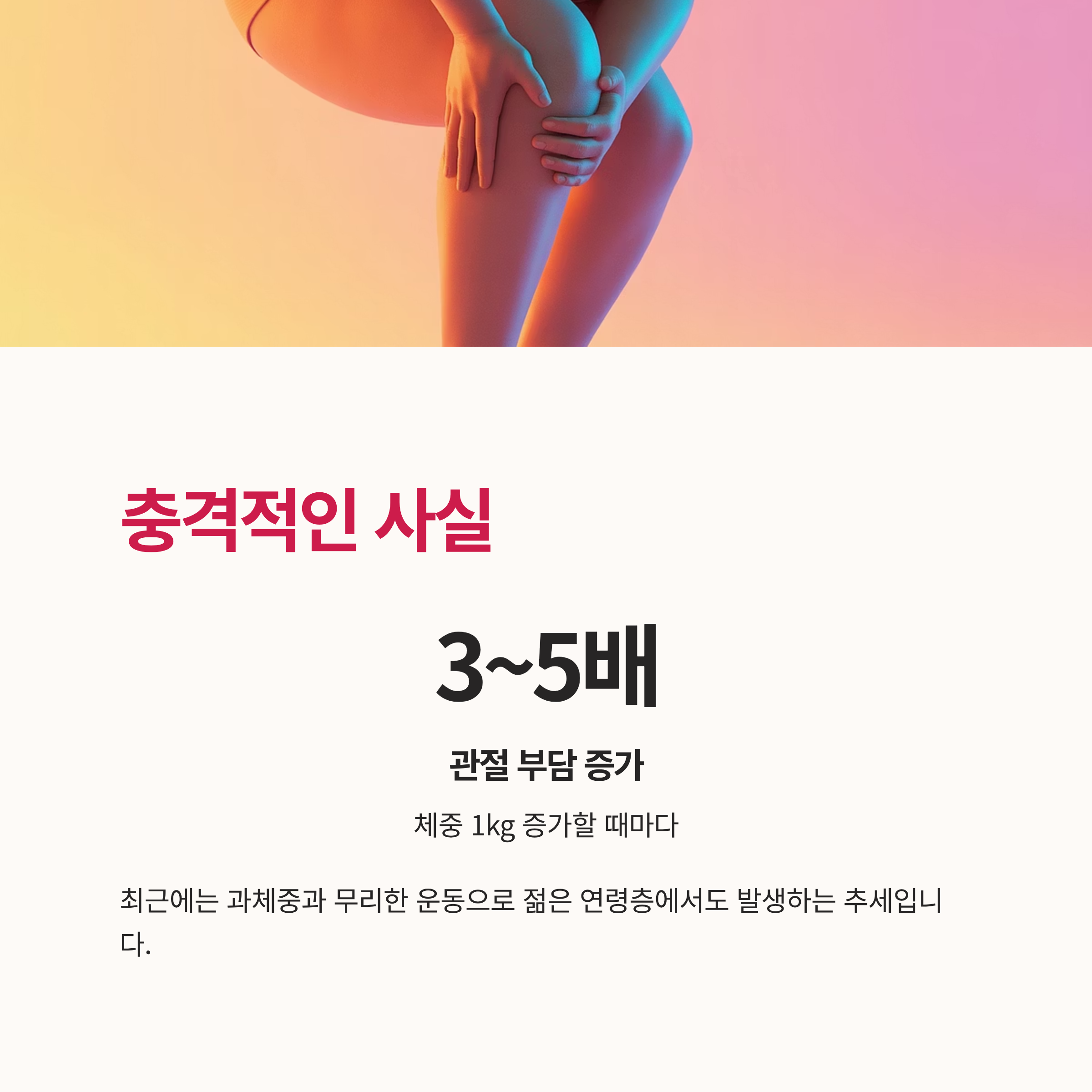 국민건강보험공단 자료에 따르면 체중을 줄이는 것만으로도 관절의 부하가 감소되어 통증을 줄일 수 있습니다. 과체중이거나 비만일수록 퇴행성 관절염이 빨리 나타나며, 체중 1kg 증가 시 관절 부담은 3~5배 증가합니다.