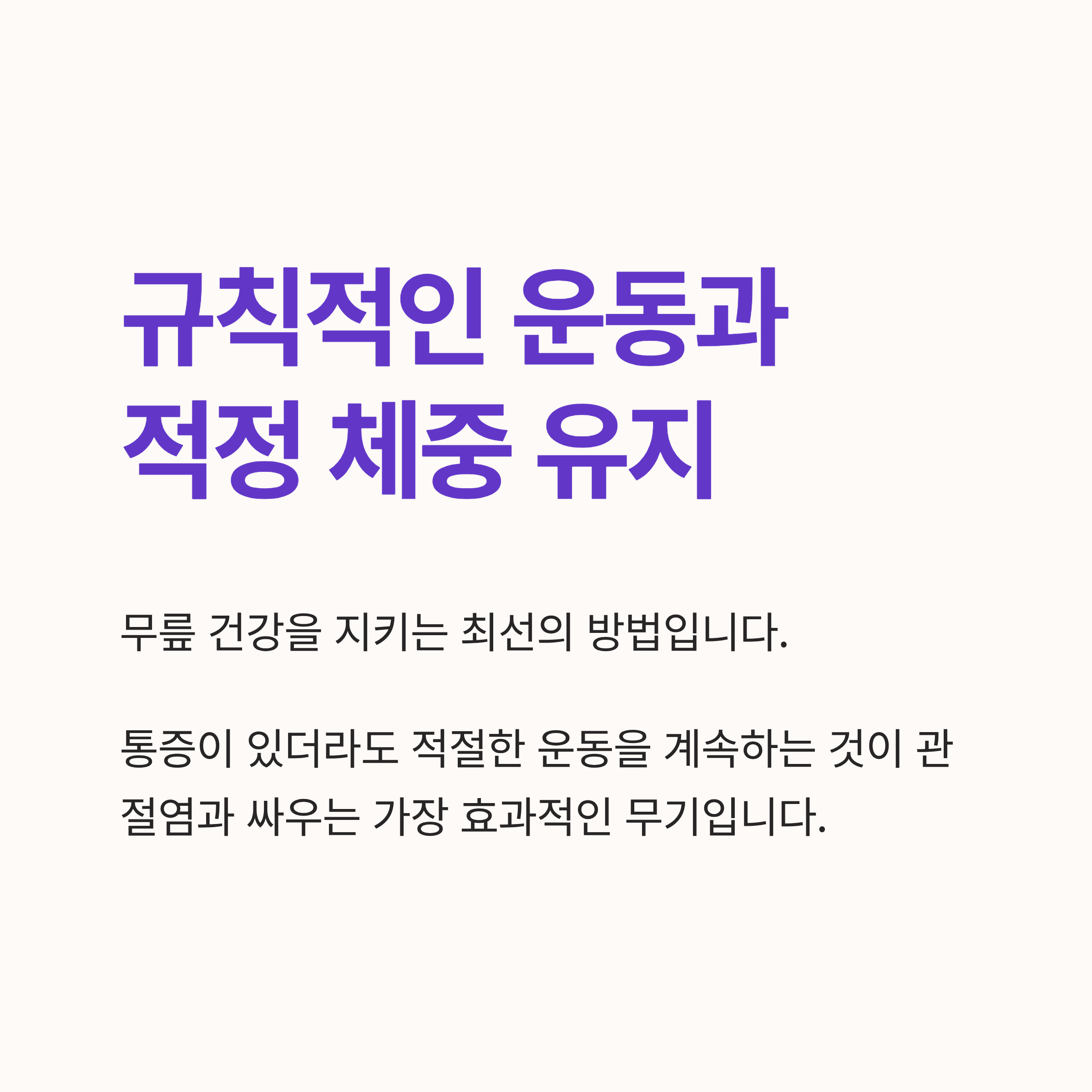 기억하세요: 규칙적인 운동과 적정 체중 유지가 무릎 건강을 지키는 최선의 방법입니다. 통증이 있더라도 적절한 운동을 계속하는 것이 관절염과 싸우는 가장 효과적인 무기입니다.