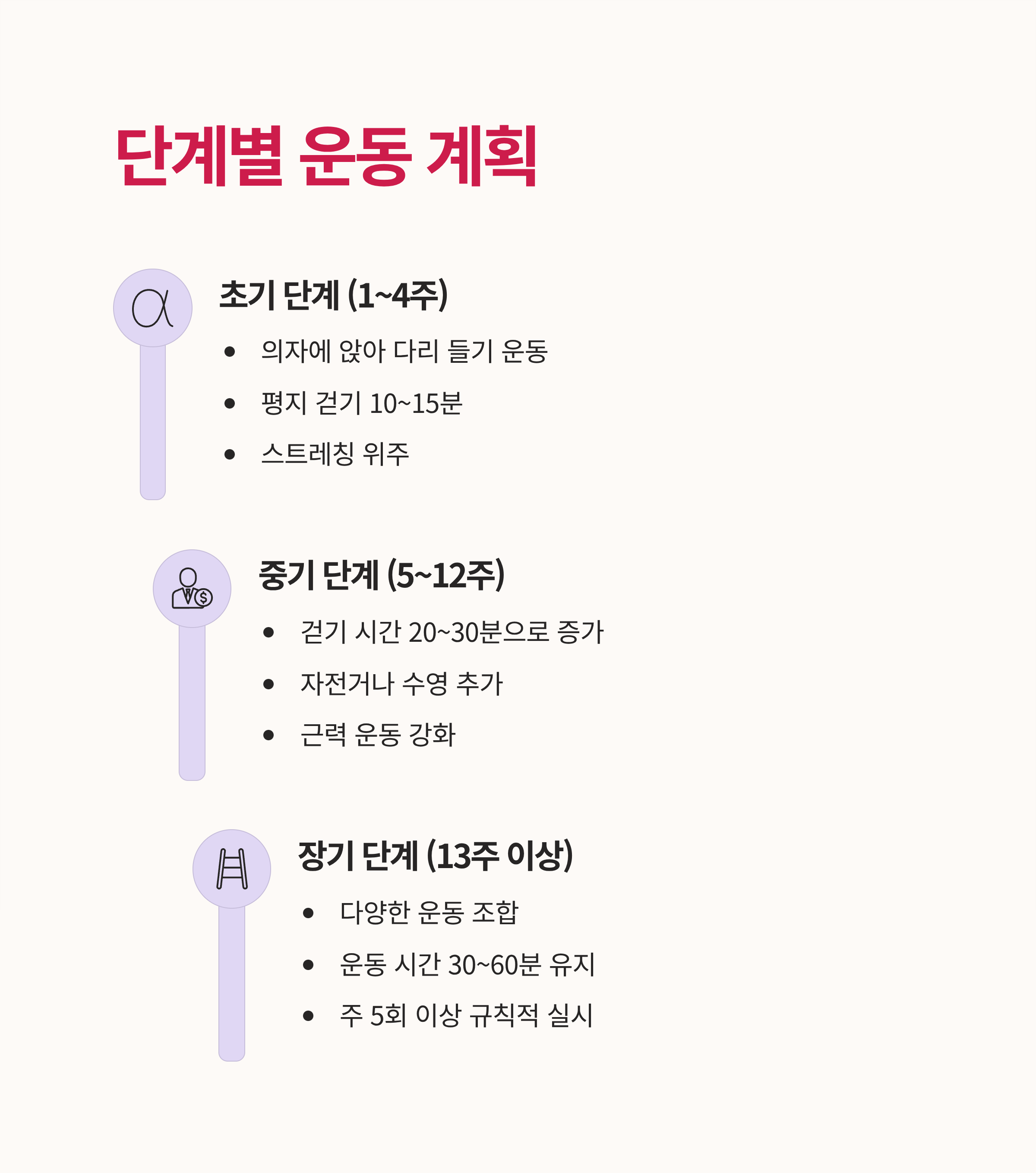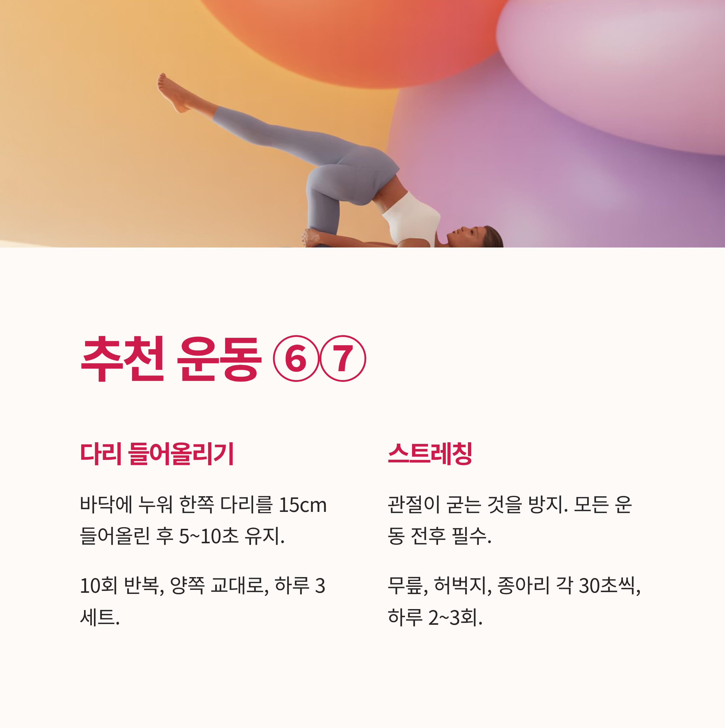 오늘부터 하루 10분, 의자에 앉아 다리 들어올리기부터 시작하세요. 평지를 천천히 걷고, 수영이나 자전거를 즐기세요. 계단과 등산은 피하고, 체중 관리에 힘쓰세요.