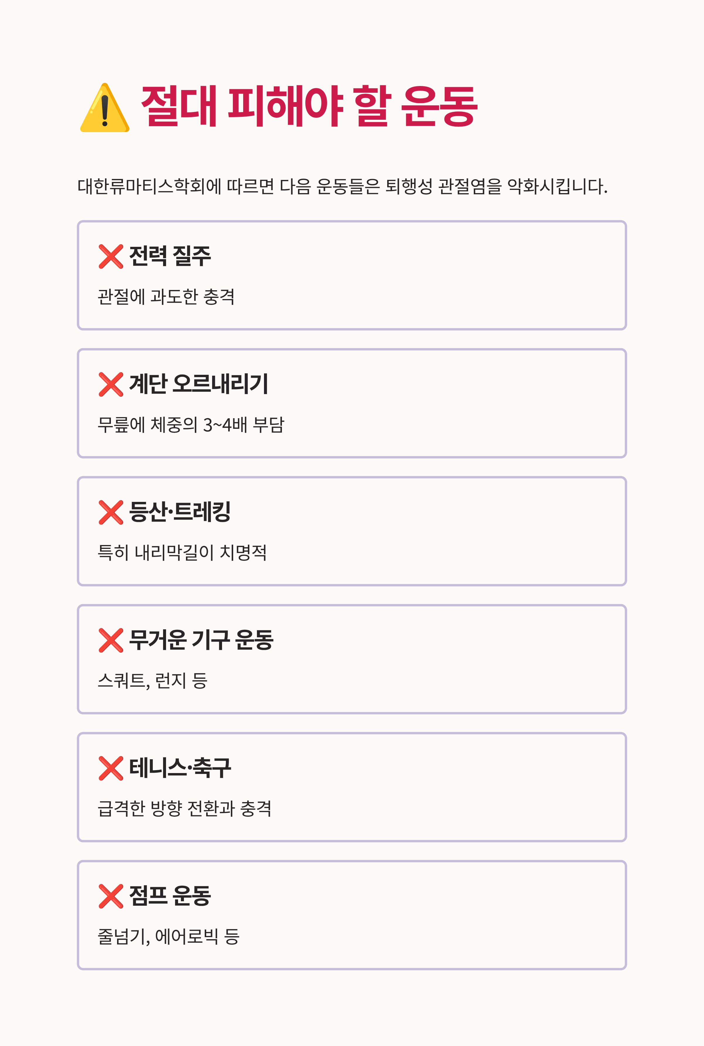 대한류마티스학회에 따르면 다음 운동들은 퇴행성 관절염을 악화시킵니다: