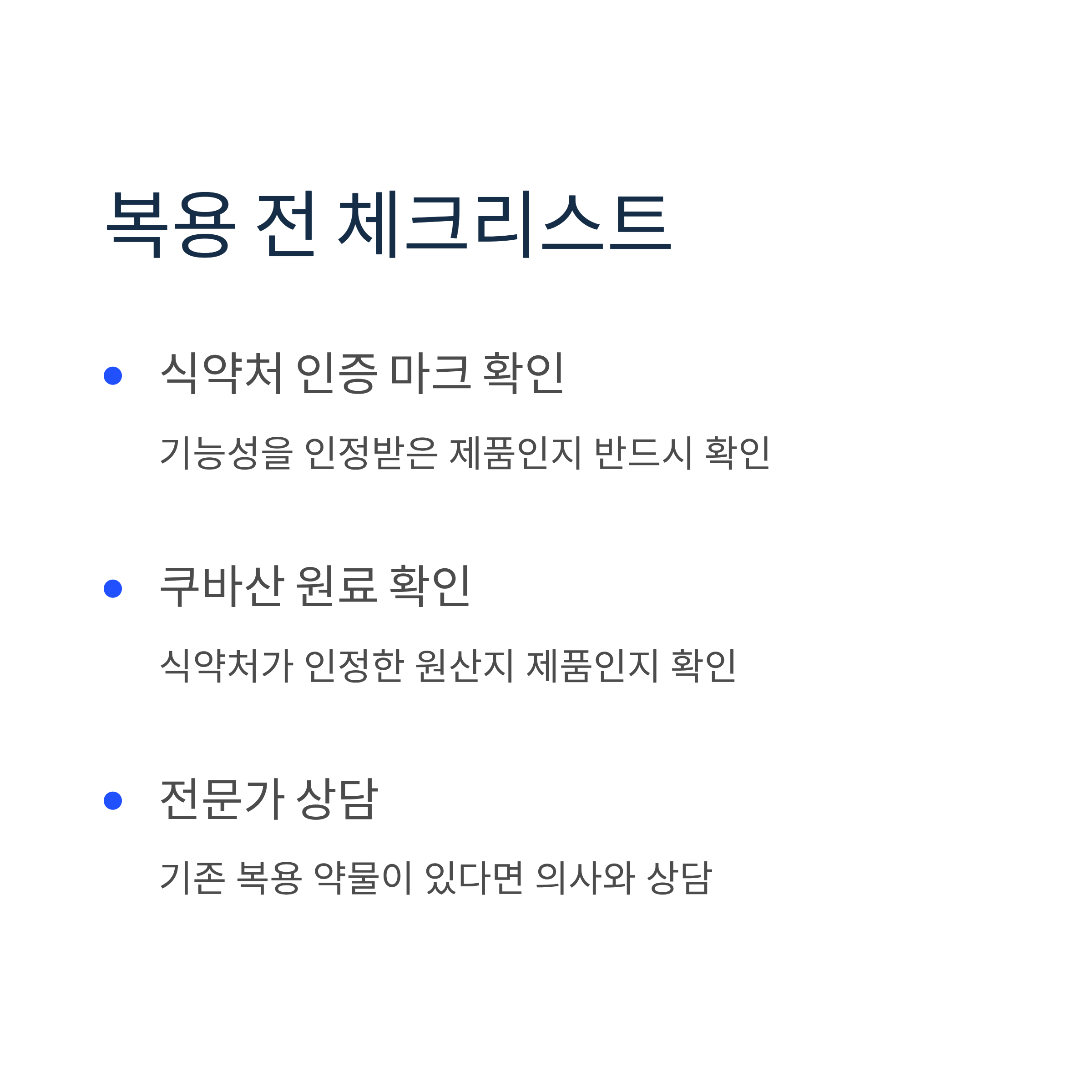 복용 전에는 반드시 식약처 인증 마크를 확인하고, 기존에 복용 중인 약물이 있다면 전문가와 상담 후 섭취하시기 바랍니다.