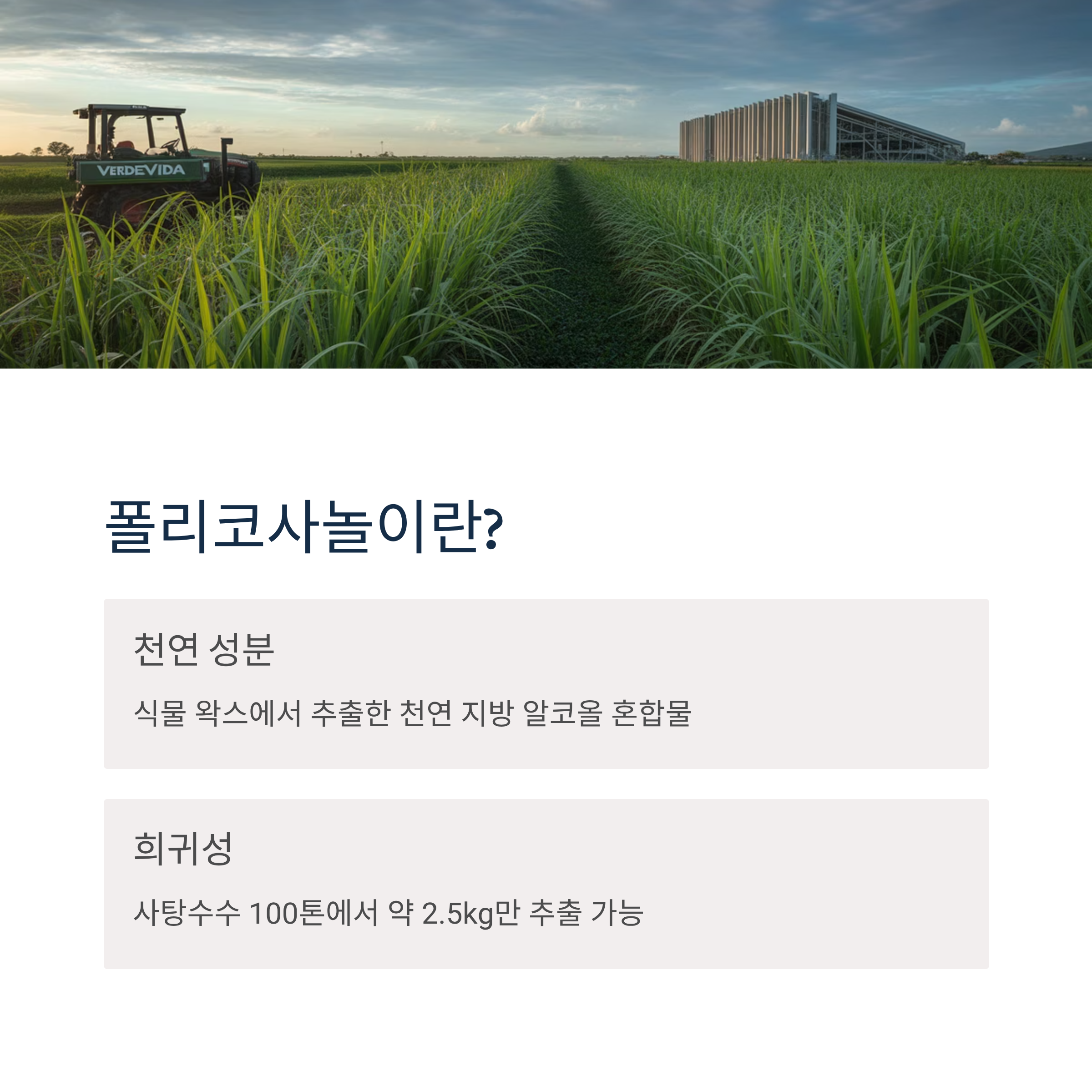 폴리코사놀은 식물 왁스에서 추출한 천연 지방 알코올 혼합물로, 두 개 이상의 알코올이 사슬처럼 엮인 형태입니다. 주로 사탕수수, 쌀겨, 밀 등에서 추출되며, 사탕수수 100톤을 가공해야 약 2.5kg 정도만 추출될 정도로 희귀한 성분입니다.