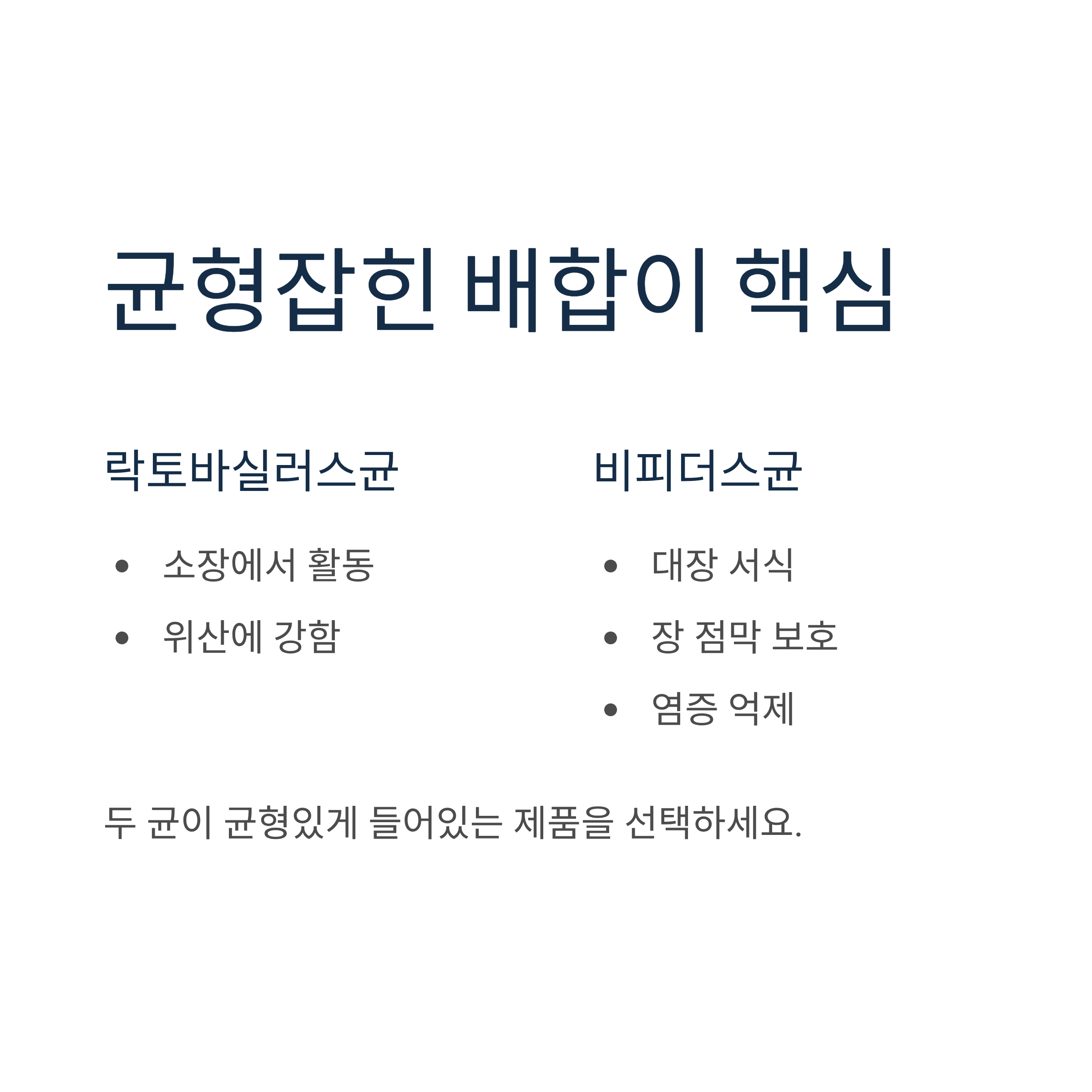 락토바실러스균과 비피더스균이 균형있게 들어있는 제품을 선택하세요. 락토바실러스균은 주로 소장에서 활동하며 위산에 강하고, 비피더스균은 대장을 서식지로 삼아 장 점막 보호와 염증 억제에 효과적입니다.