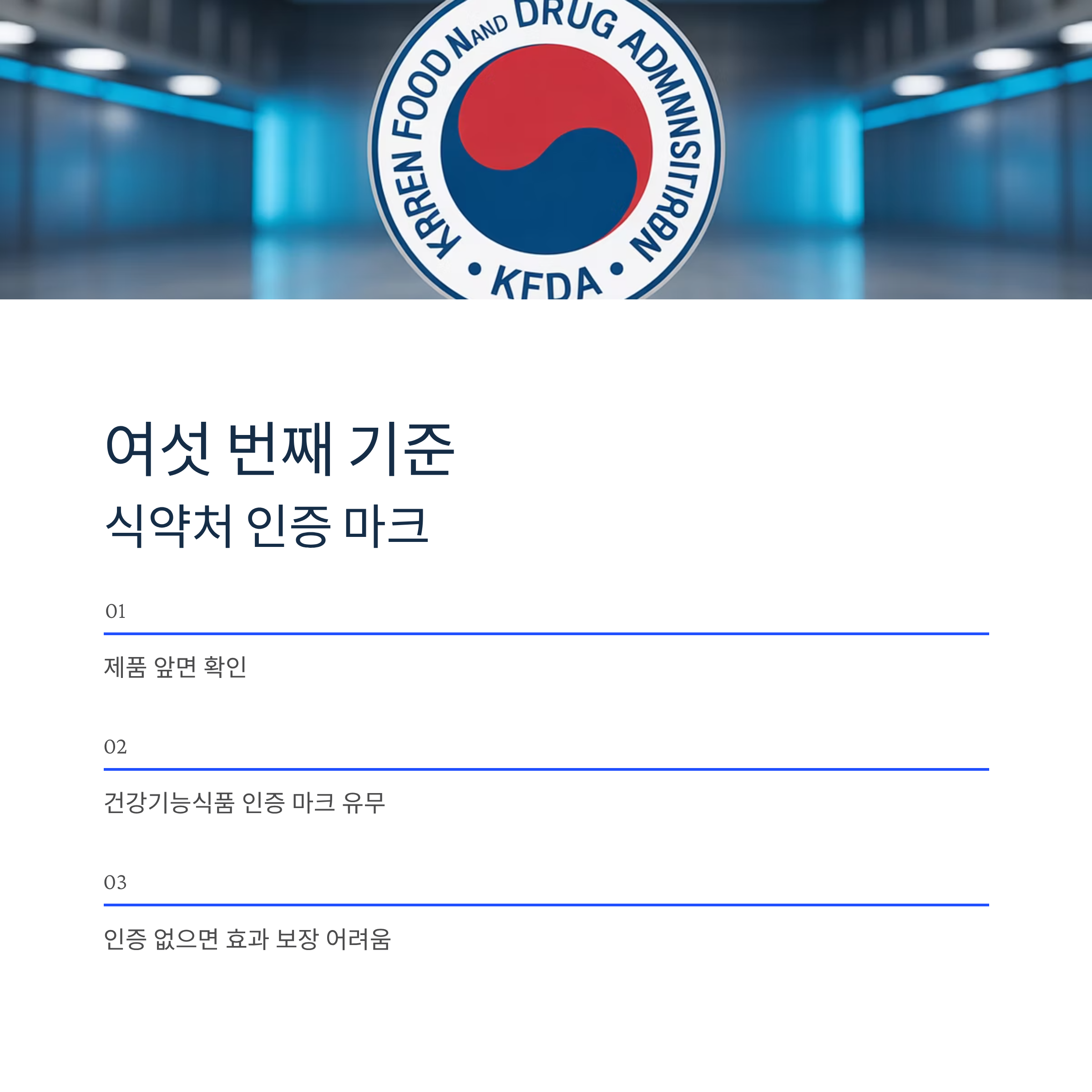 제품 앞면에 식약처 건강기능식품 인증 마크가 없다면 식약처가 인정한 제품이 아니므로 주의해야 합니다. 건강기능식품으로 인증받지 않은 일반 식품은 효과를 보장받기 어렵습니다.
