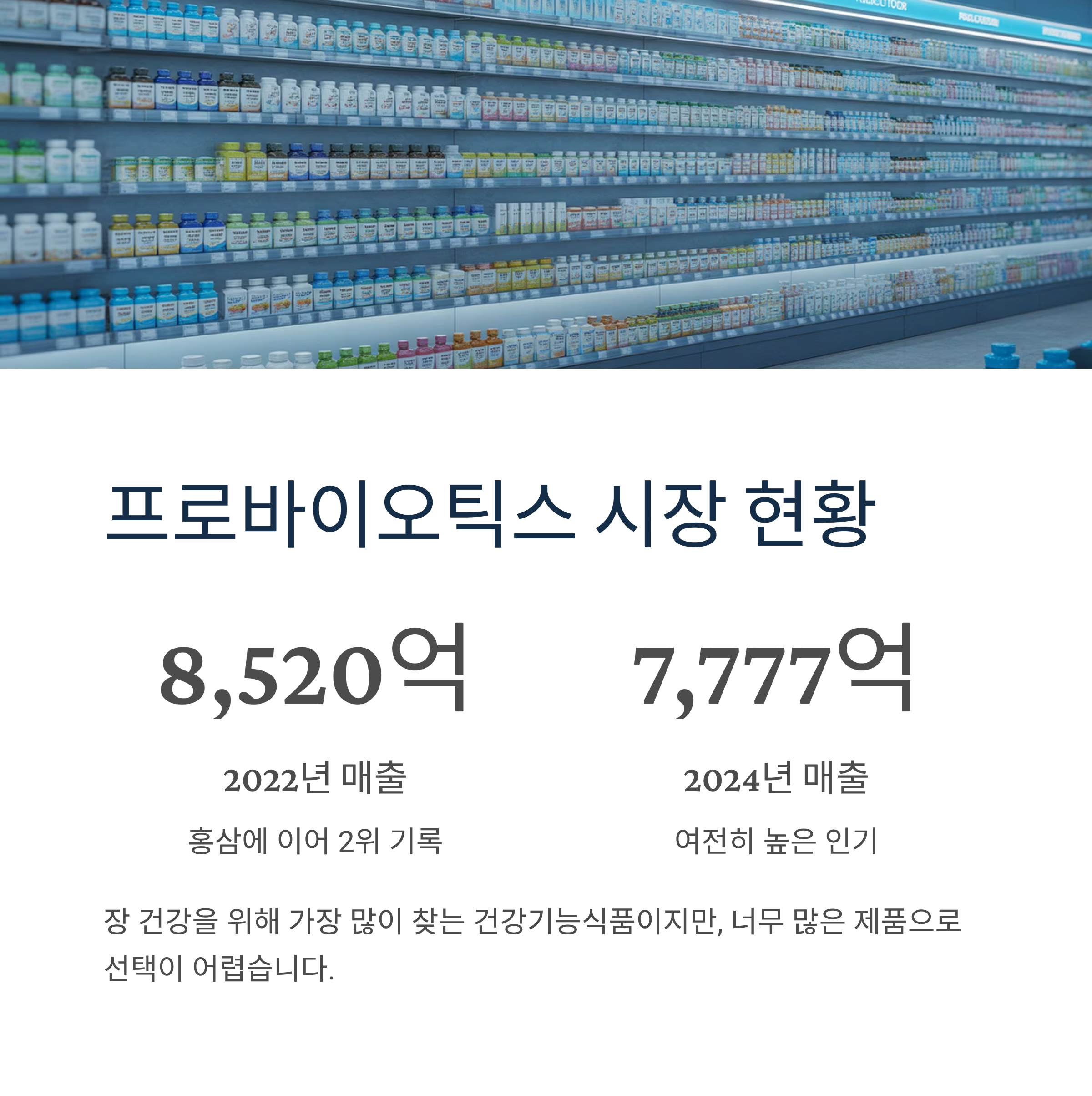 식약처에 따르면 국내 프로바이오틱스 매출은 2022년 8,520억원으로 홍삼에 이어 2위를 차지했지만, 2024년에는 7,777억원으로 감소했습니다. 하지만 여전히 프로바이오틱스는 장 건강을 위해 가장 많이 찾는 건강기능식품입니다. 문제는 시중에 너무 많은 제품이 나와 있어 어떤 기준으로 선택해야 할지 모르겠다는 것입니다. 투입균수 1000억을 홍보하는 제품, 19종 균주를 강조하는 제품까지 다양합니다. 과연 무엇을 기준으로 선택해야 할까요?