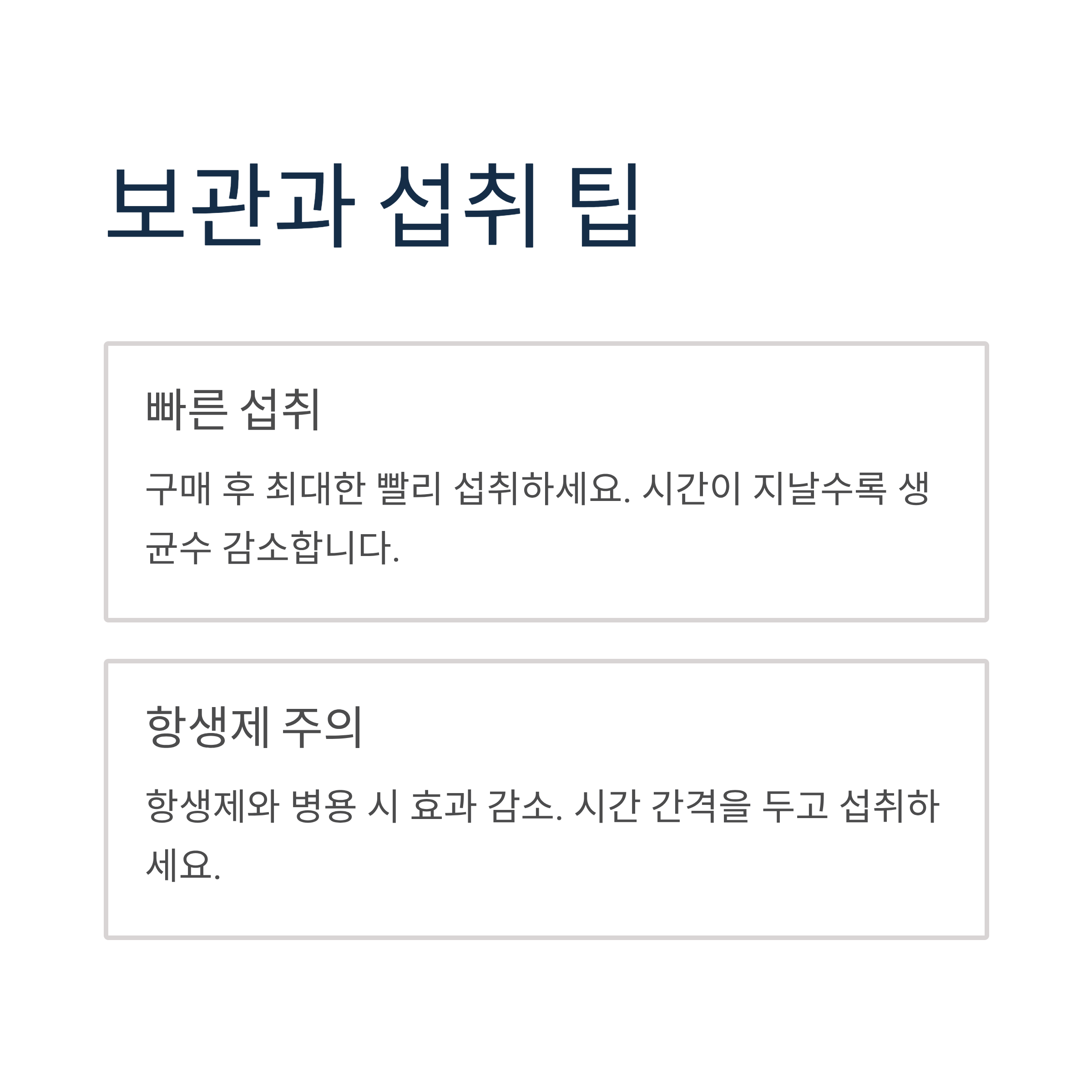 프로바이오틱스는 구매 후 최대한 빨리 섭취하는 것이 좋습니다. 시간이 지날수록 생균수가 감소하기 때문입니다. 또한 항생제와 병용 섭취 시 효과가 감소할 수 있으므로 시간 간격을 두고 섭취하세요.