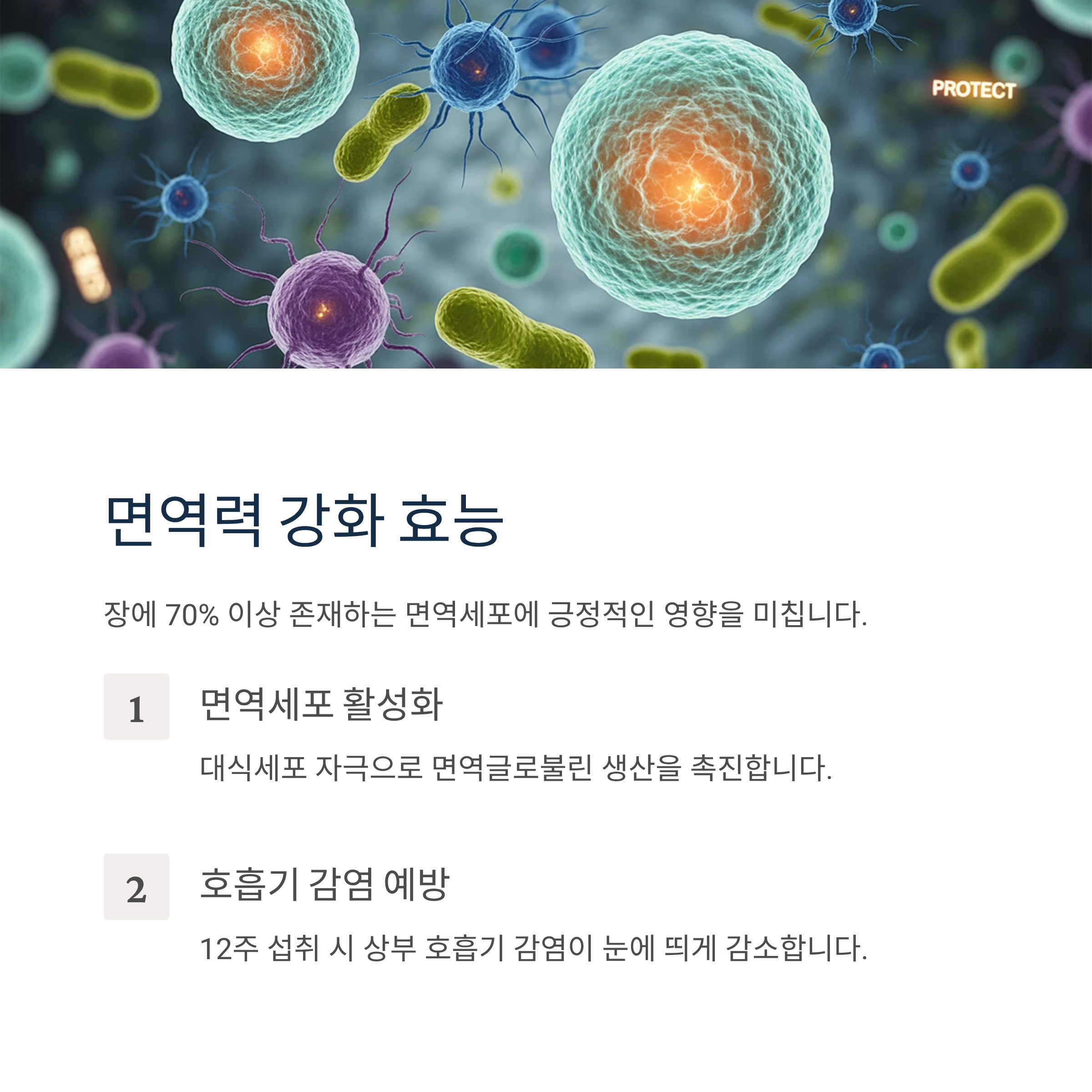 프로바이오틱스 효능 중 면역력 강화는 장에 70% 이상 존재하는 면역세포에 긍정적인 영향을 미치는 것에서 비롯됩니다.