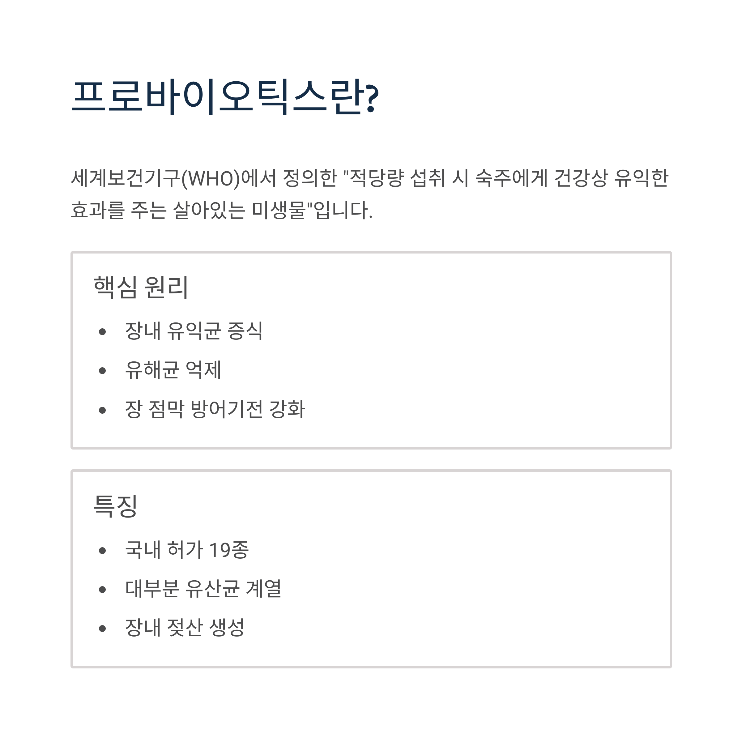 프로바이오틱스 효능은 세계보건기구(WHO)에서 정의한 "적당량 섭취 시 숙주에게 건강상 유익한 효과를 주는 살아있는 미생물"의 기능에서 비롯됩니다. 프로바이오틱스는 유산균을 포함해 체내에서 건강에 좋은 효과를 주는 살아있는 균을 의미하며, 장에 도달해 유익균은 증식시키고 유해균은 억제하는 것이 핵심 효능입니다.