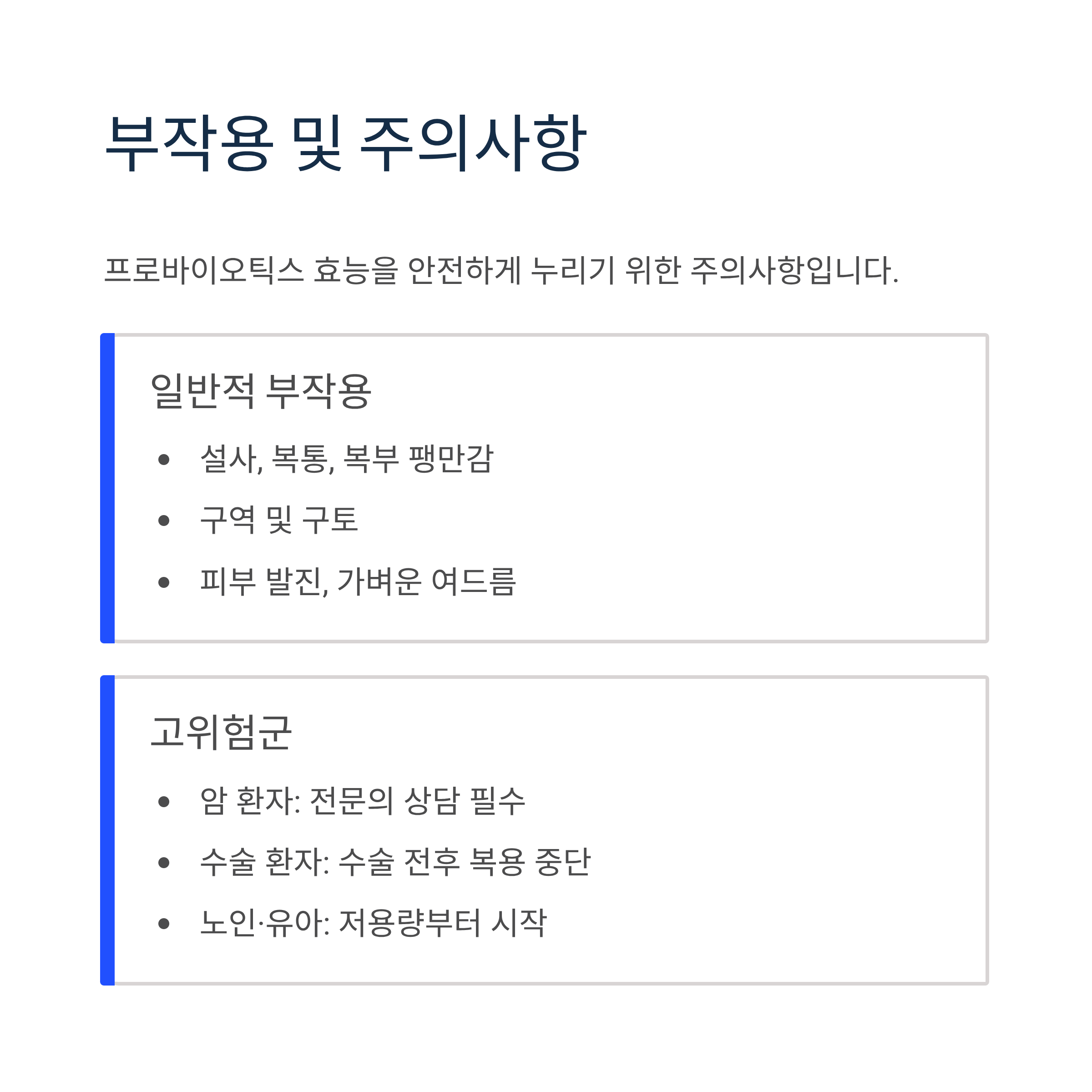 프로바이오틱스 효능을 안전하게 누리기 위해서는 부작용과 주의사항을 반드시 알아두어야 합니다.