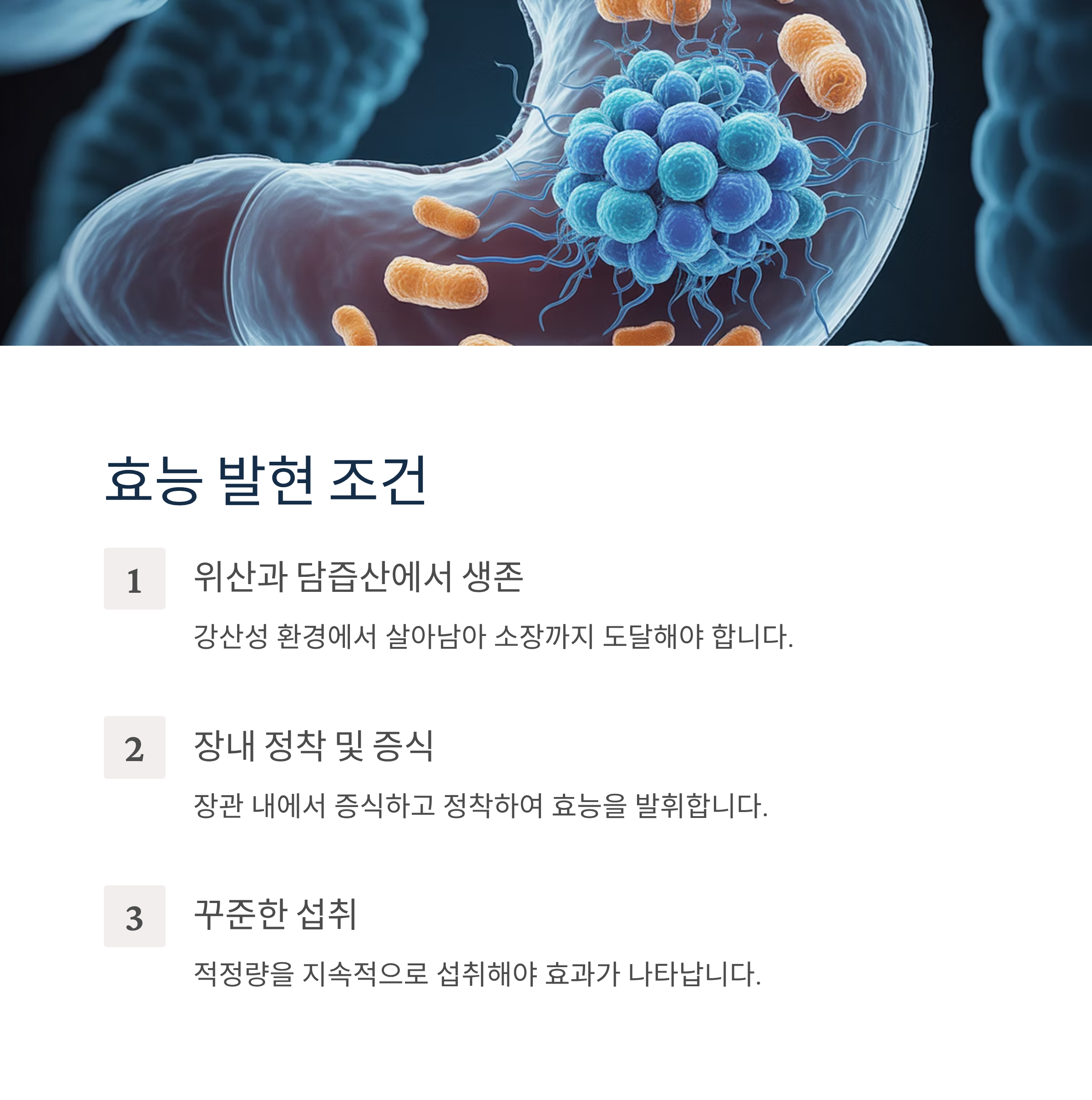 프로바이오틱스의 효능이 제대로 발휘되려면 위산과 담즙산 등 강산에서 살아남아 소장까지 도달해 장관 내에서 증식하고 정착해야 합니다. 또한 독성이 없고 비병원성이어야 하며, 적정량을 꾸준히 섭취해야 합니다.