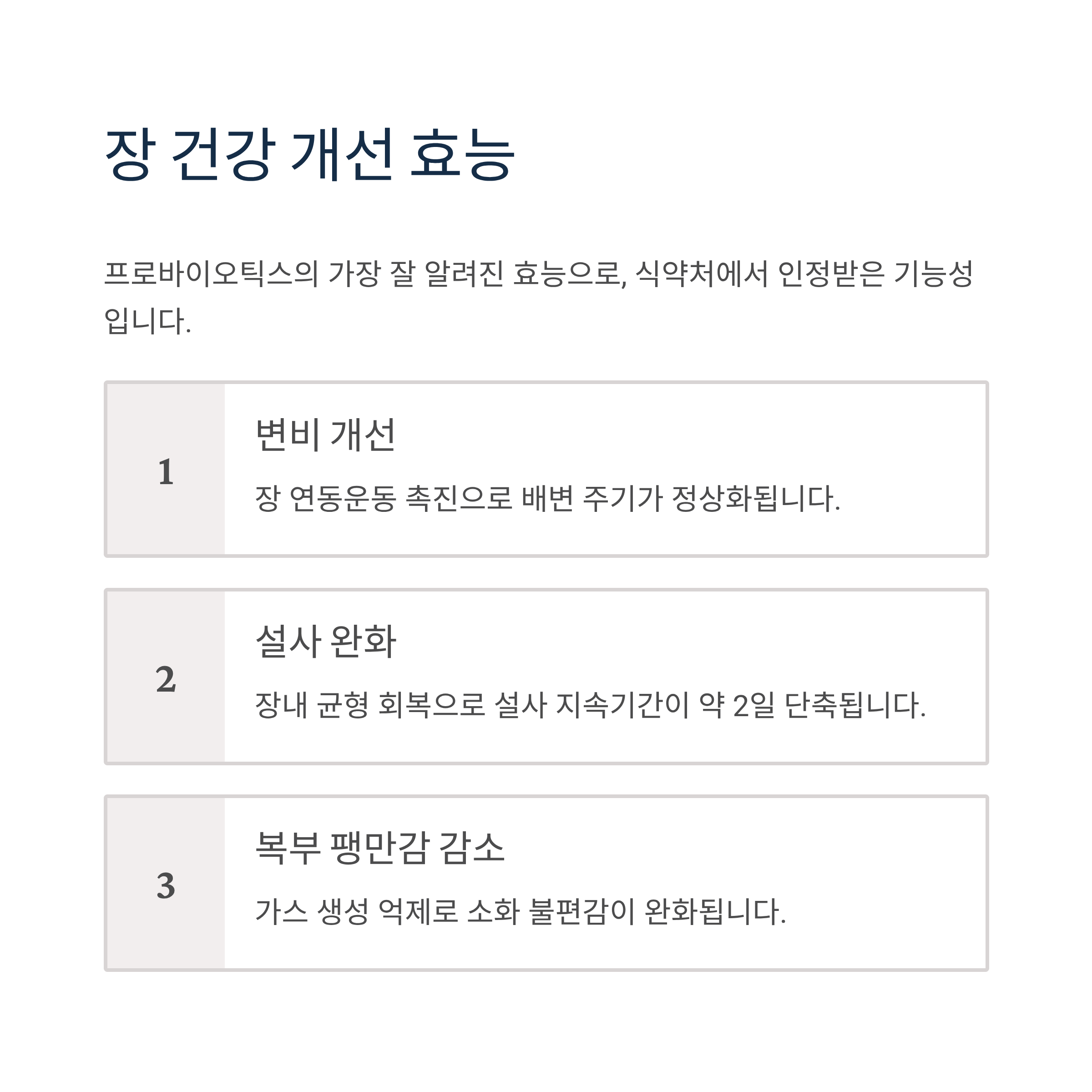 프로바이오틱스 효능 중 가장 잘 알려진 것이 장 건강 개선입니다. '유산균 증식 및 유해균 억제에 도움을 줄 수 있음'이라는 기능성으로 식약처에서 인정받고 있습니다.