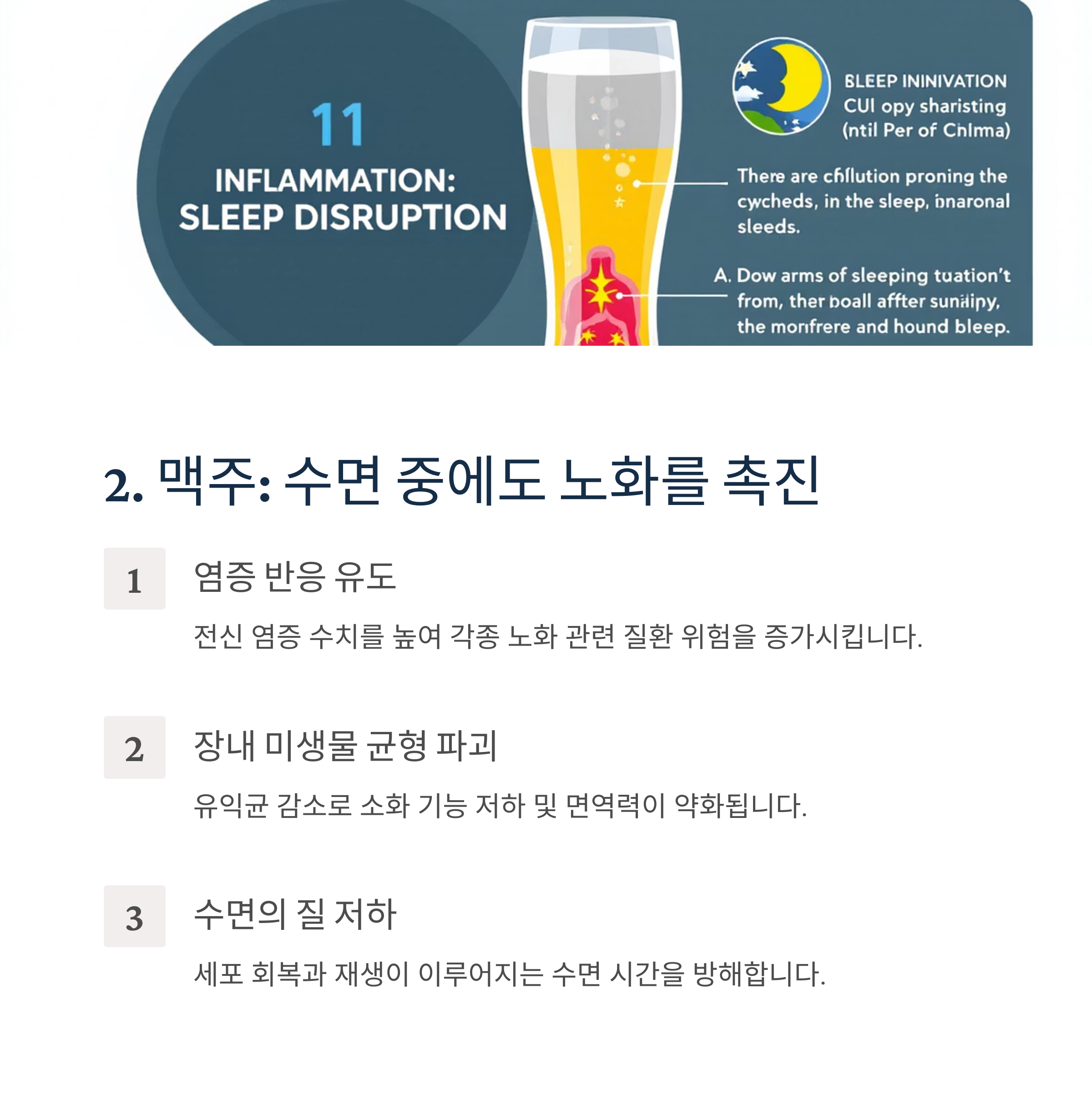 - 수면의 질 저하: 세포 회복과 재생이 이루어지는 수면 시간을 방해