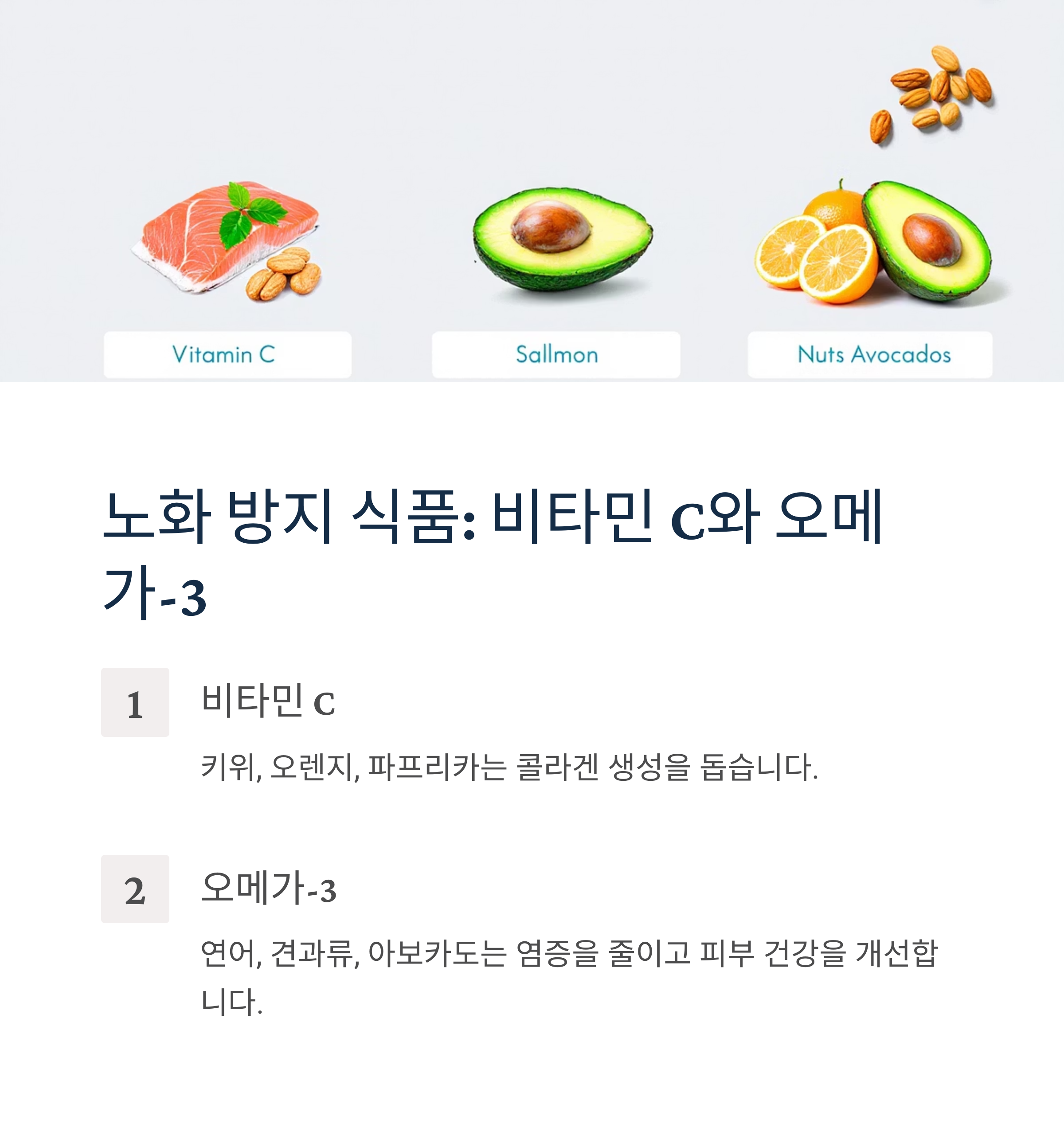 - 오메가-3 지방산: 연어, 견과류, 아보카도