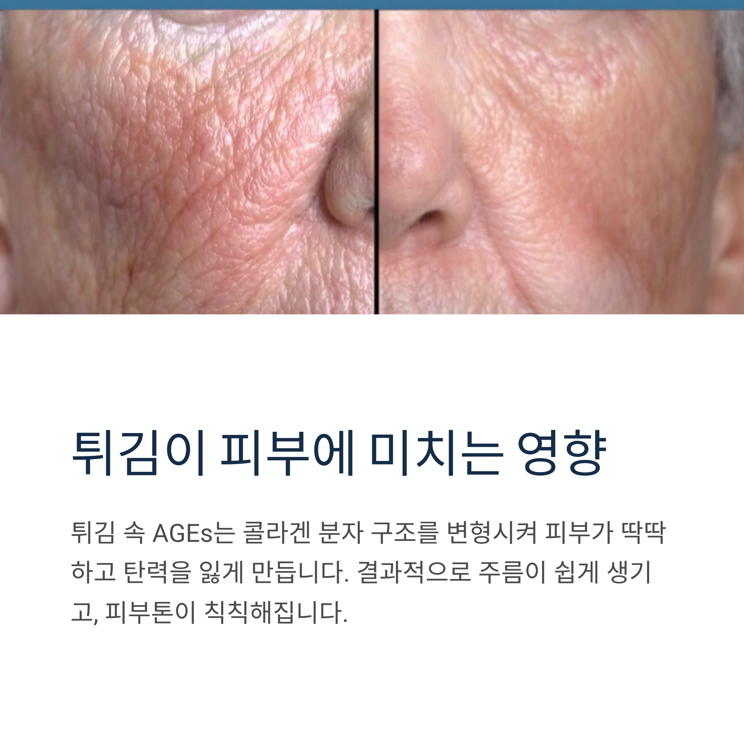 콜라겐은 피부 탄력과 수분 유지에 핵심적인 역할을 합니다. 그런데 튀김 속 AGEs는 콜라겐 분자 구조를 변형시켜 피부가 딱딱하고 탄력을 잃게 만듭니다. 결과적으로 주름이 쉽게 생기고, 피부톤이 칙칙해지며, 전반적인 피부 노화가 가속화됩니다.