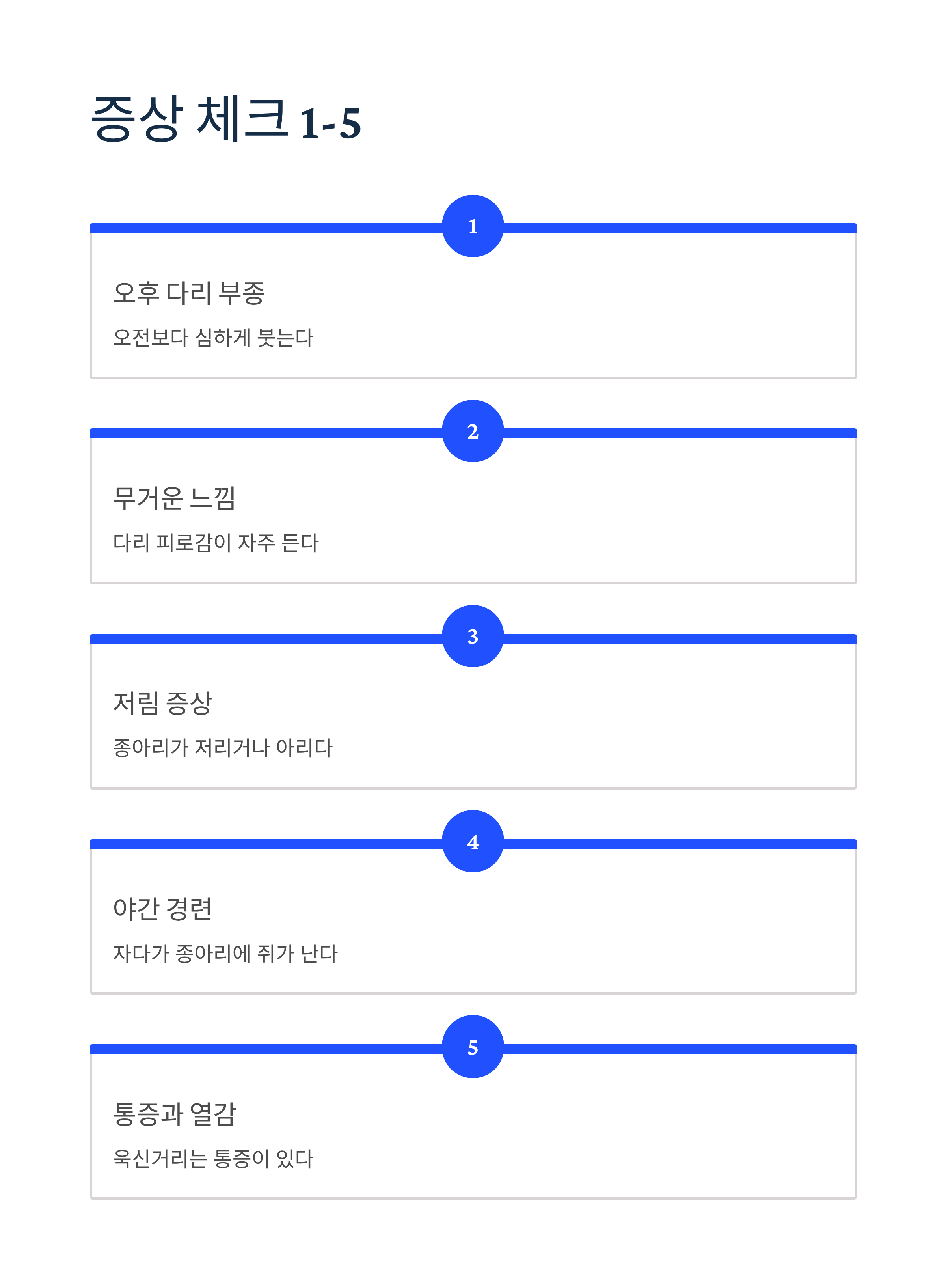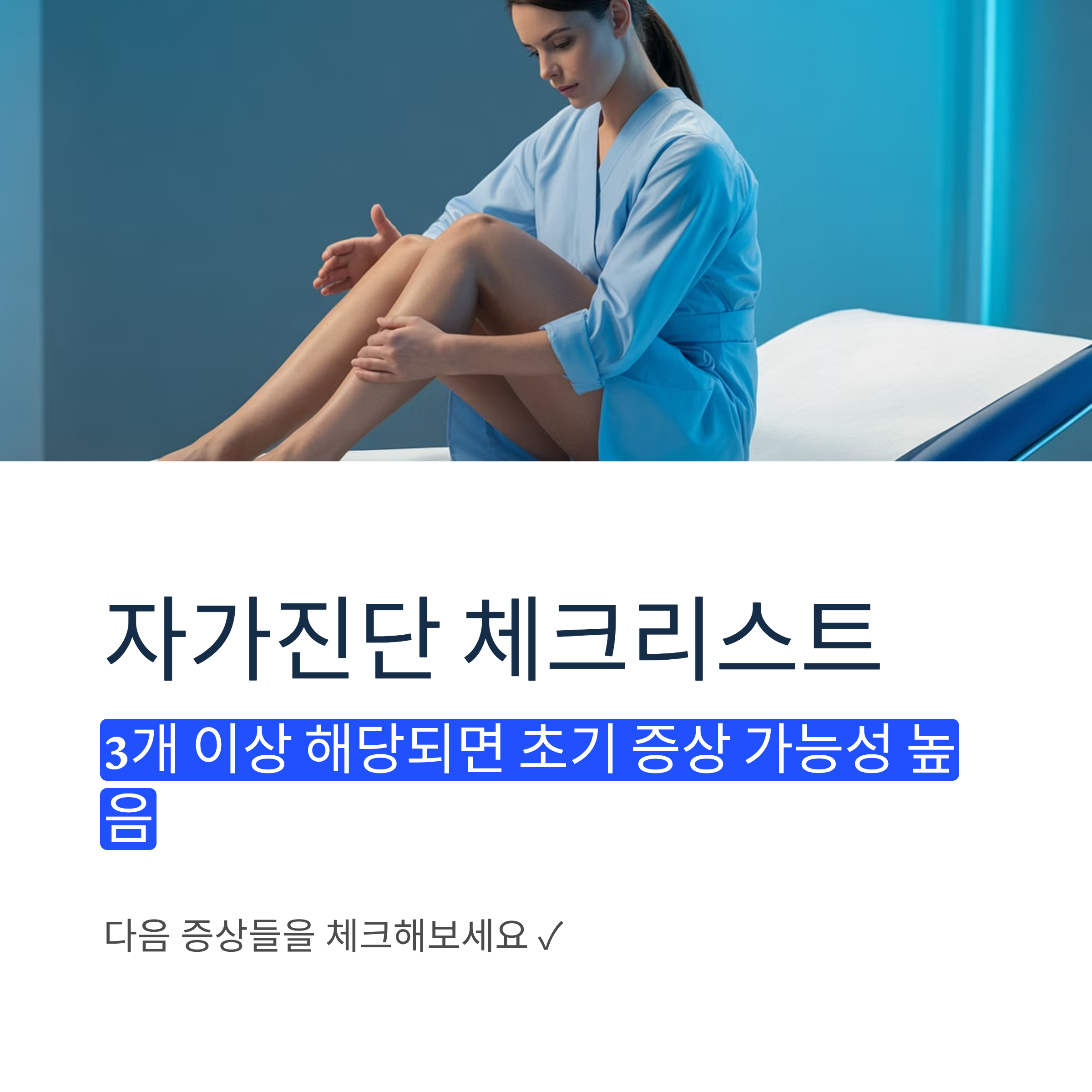 아래 목록 중 3개 이상에 해당된다면 하지정맥류 초기 증상일 가능성이 높습니다.