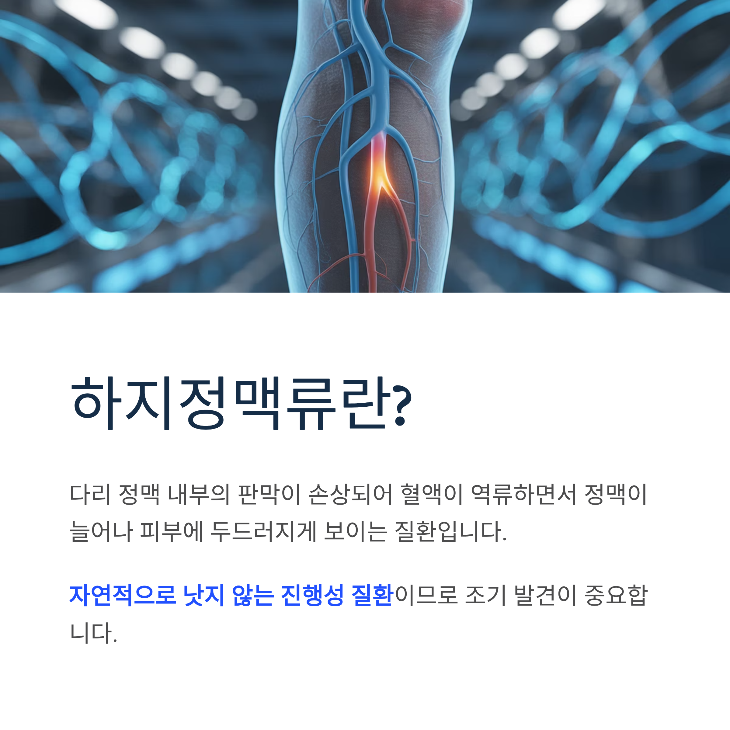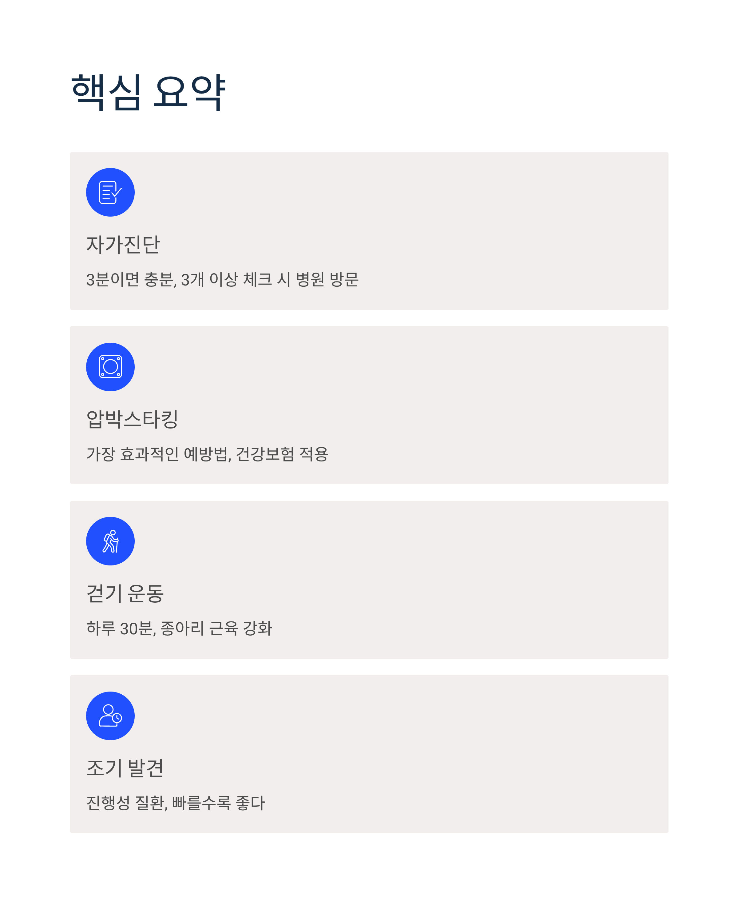 하지정맥류 자가진단은 3분이면 충분합니다. 체크리스트에서 3개 이상 해당된다면 주저하지 말고 혈관외과를 방문하세요. 의료용 압박스타킹 착용과 걷기 운동만으로도 초기 증상은 크게 개선될 수 있습니다. 진행성 질환이므로 조기 발견과 예방이 가장 중요합니다.