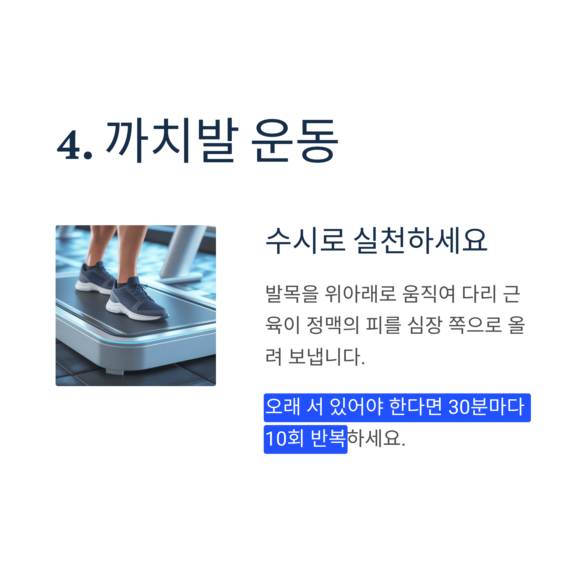 까치발 운동은 발목을 위아래로 움직여 다리 근육이 하지 정맥의 피를 심장 쪽으로 올려 보내는데 도움을 줍니다. 오래 서 있어야 한다면 30분마다 까치발 동작을 10회 반복하세요.