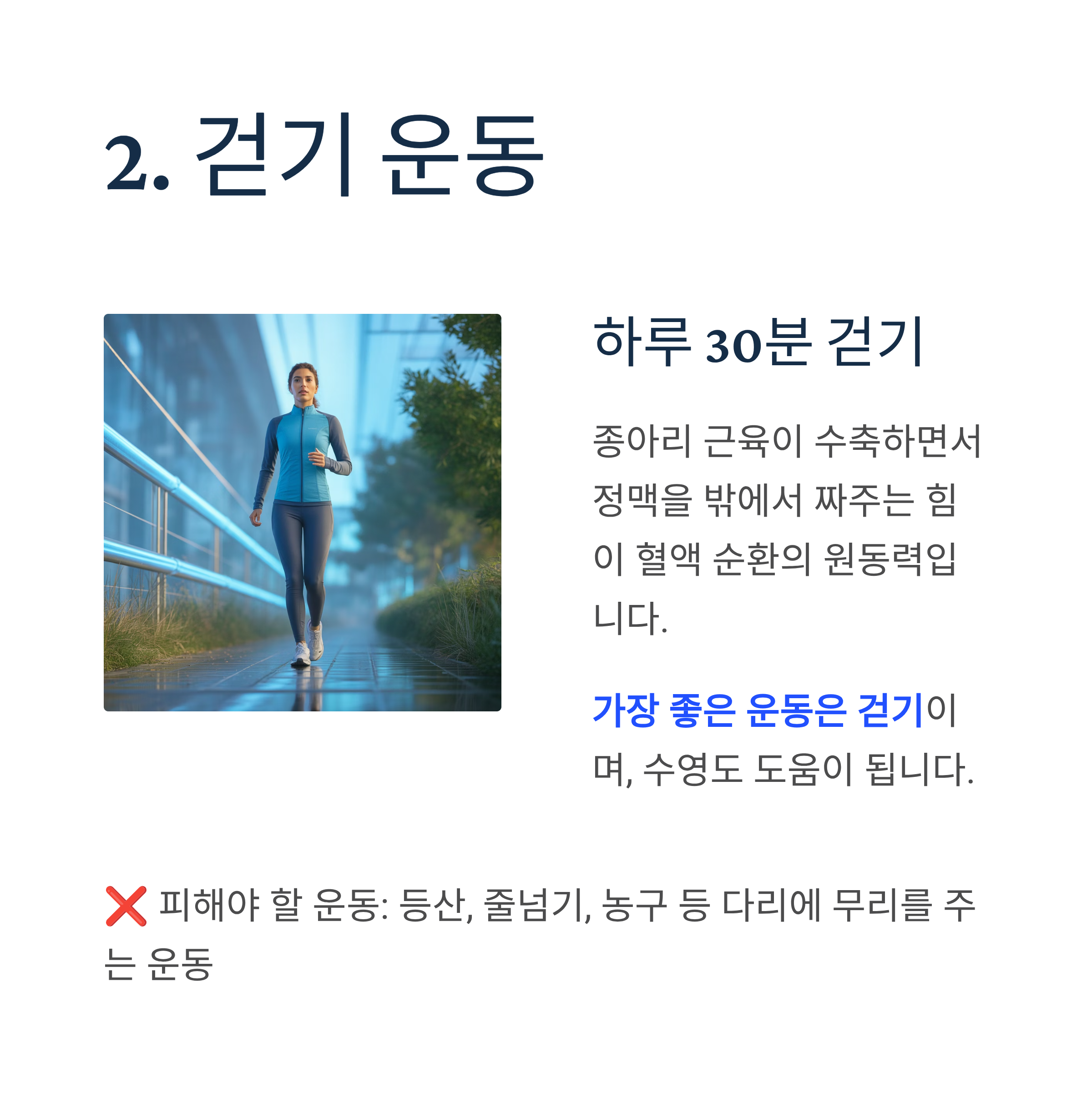혈액이 심장 방향으로 흐르게 하는 원동력은 종아리 근육이 수축하면서 정맥을 밖에서 짜주는 힘입니다. 자주 스트레칭이나 걷기 운동을 하면서 종아리 근육을 사용하는 것이 예방에 도움이 됩니다.