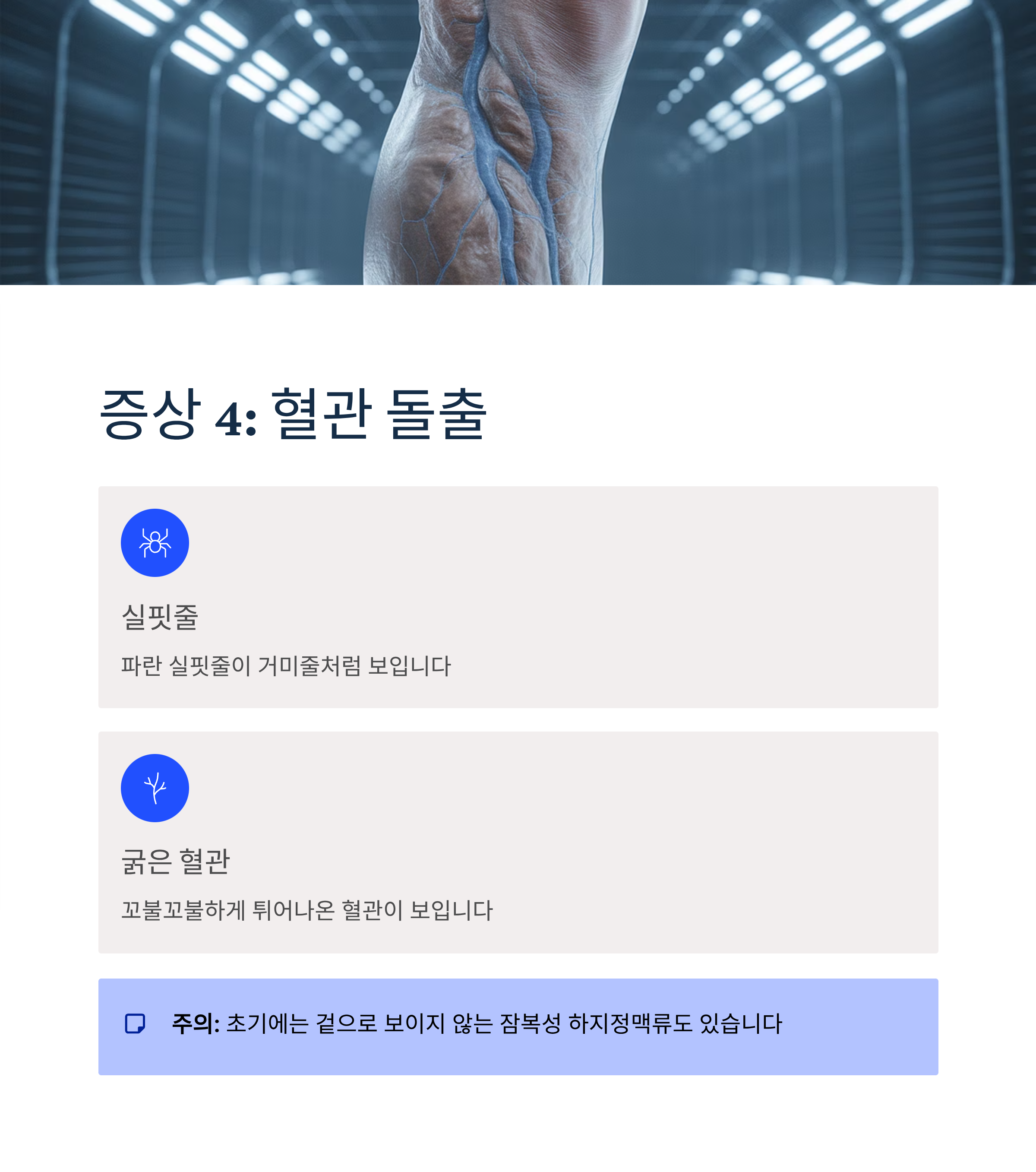 종아리 뒤쪽이나 다리 안쪽에 파란 실핏줄이 거미줄처럼 보이거나, 굵은 혈관이 꼬불꼬불하게 튀어나오는 증상입니다. 하지만 초기에는 혈관이 겉으로 보이지 않는 잠복성 하지정맥류도 있어 주의가 필요합니다.