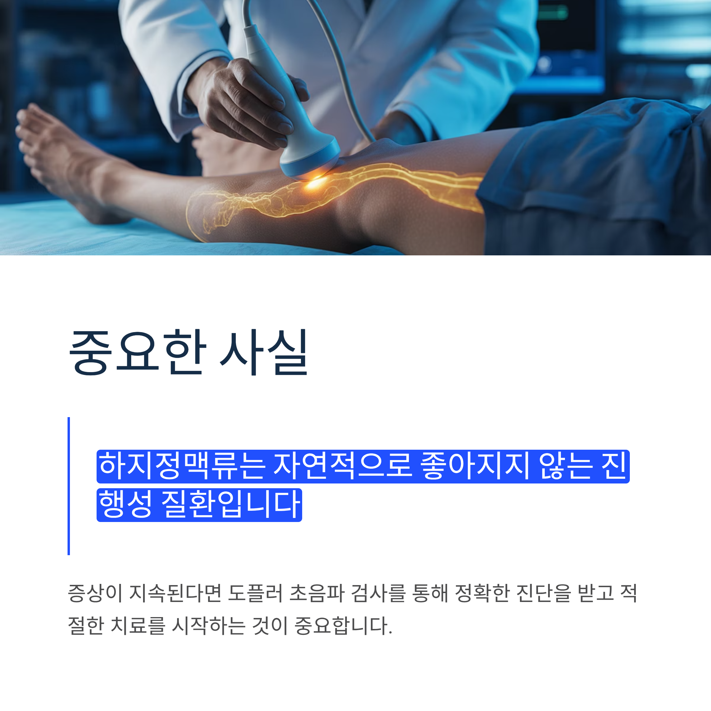 하지정맥류는 자연적으로 좋아지지 않는 진행성 질환입니다. 위와 같은 증상이 지속된다면 도플러 초음파 검사를 통해 정확한 진단을 받고 적절한 치료를 시작하는 것이 중요합니다.