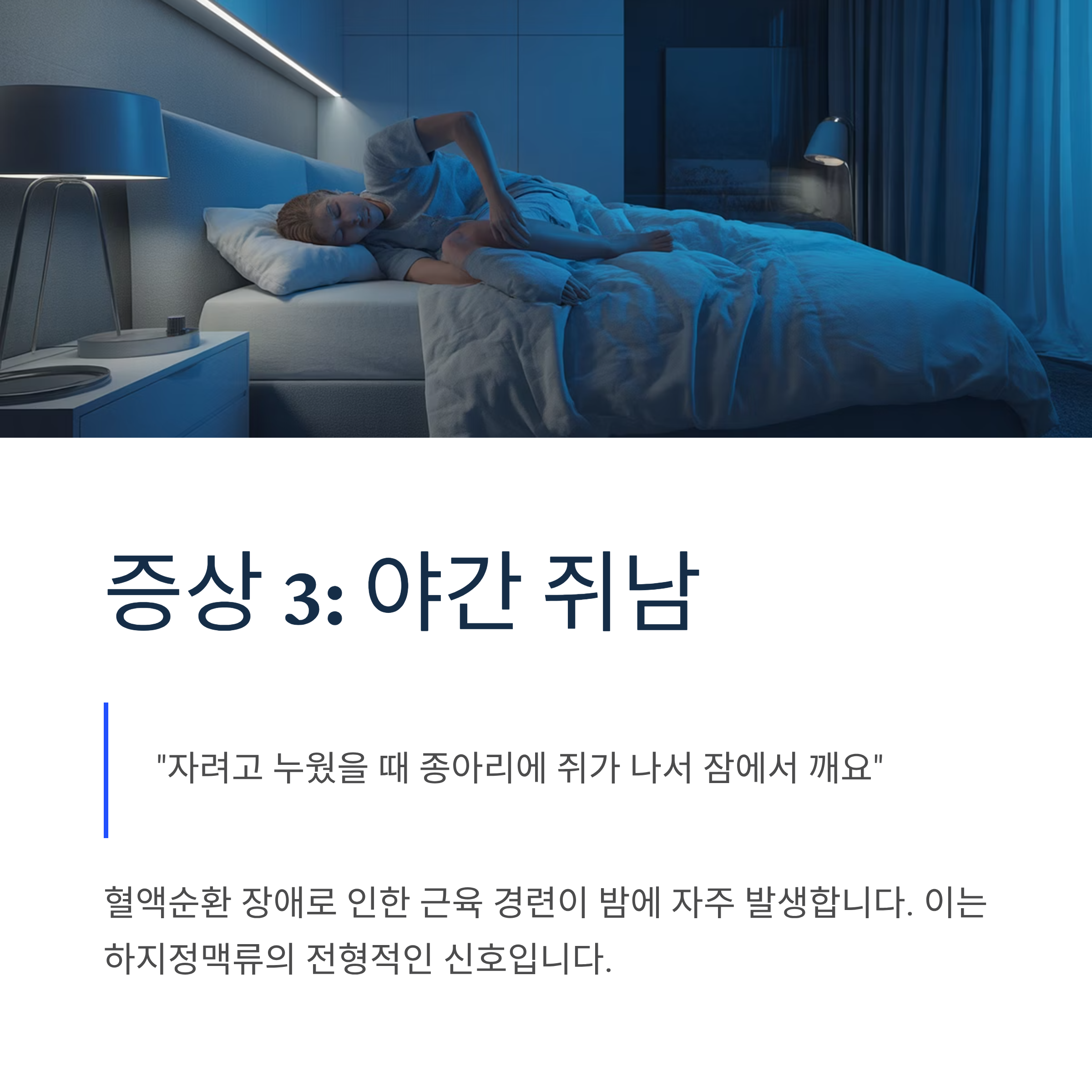 자려고 누웠을 때 종아리에 쥐가 나거나 경련이 발생해 잠에서 깨는 경우가 많습니다. 이는 혈액순환 장애로 인한 근육 경련입니다.