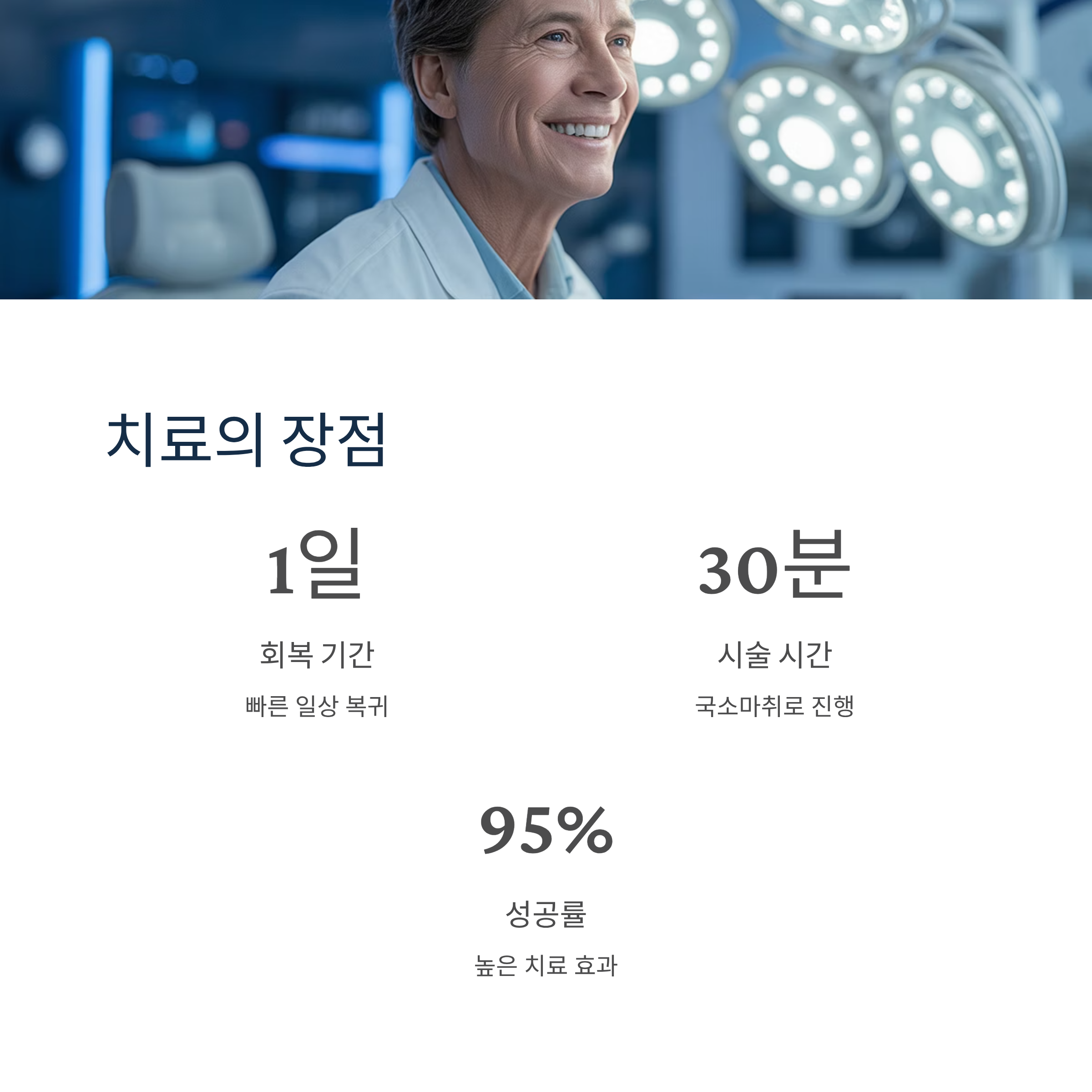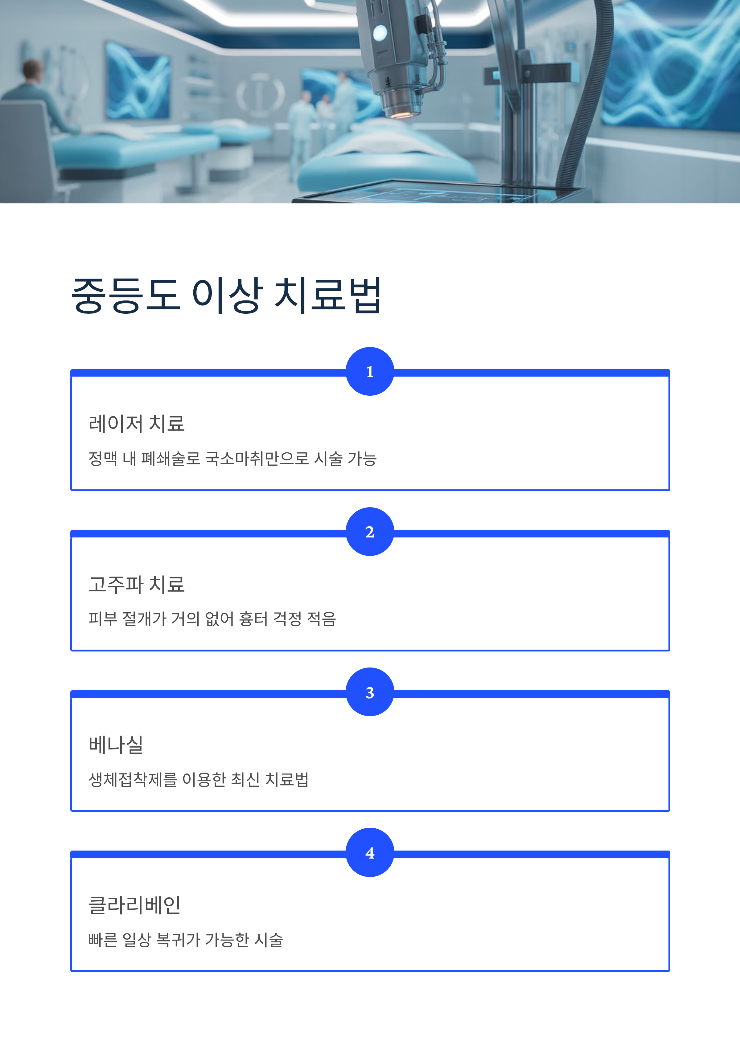 중등도 이상에서는 레이저나 고주파를 이용한 정맥 내 폐쇄술, 베나실(생체접착제), 클라리베인 등 최신 치료법이 사용됩니다. 이러한 치료는 국소마취로 진행되며 피부 절개가 거의 없어 흉터 걱정이 적고 일상생활로 빠른 복귀가 가능합니다.