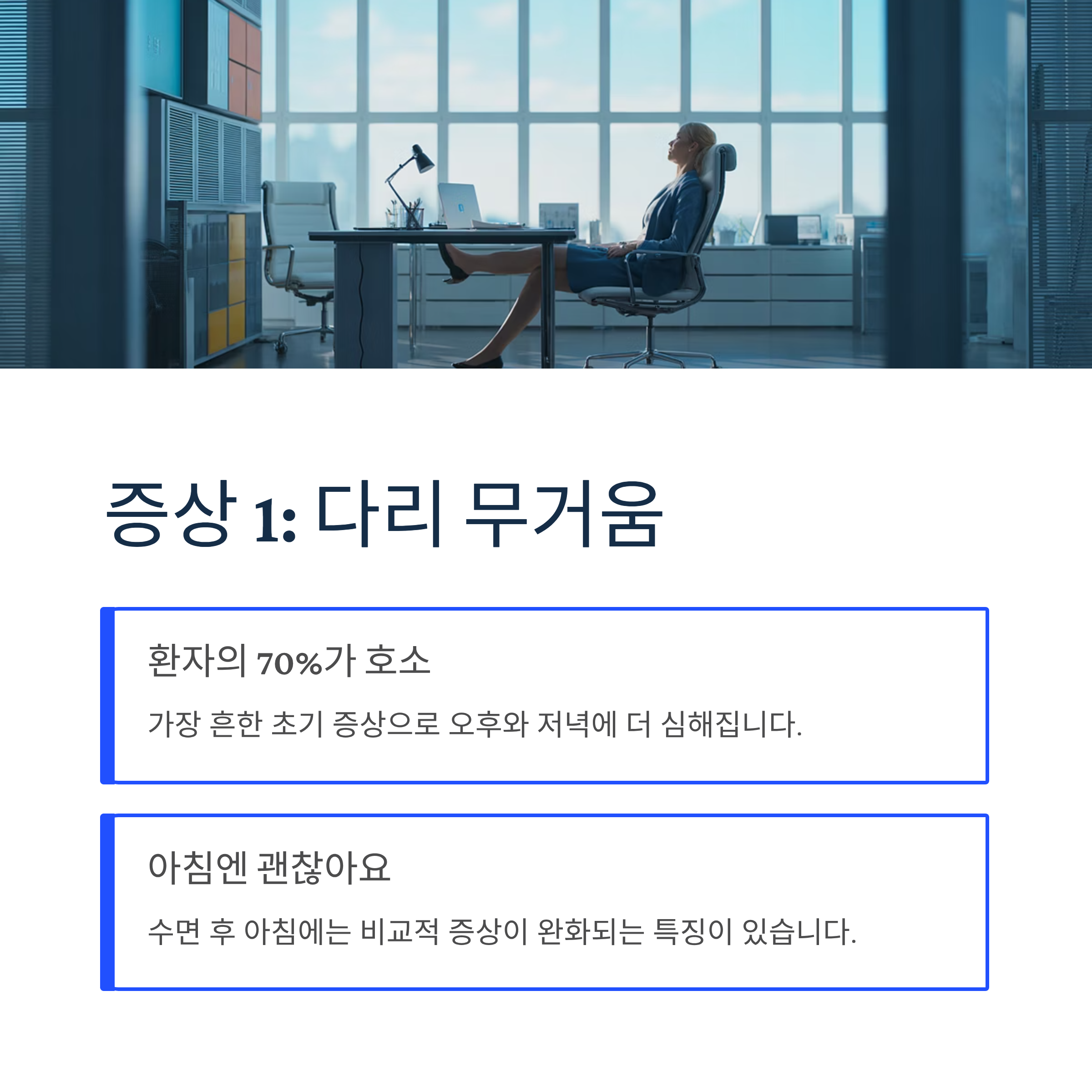 오후만 되면 다리가 무겁고 붓는다면? 단순 피로가 아닌 '하지정맥류' 초기 증상일 수 있습니다. 하지정맥류는 자연적으로 낫지 않고 시간이 경과함에 따라 증상이 악화되는 진행성 질환입니다.