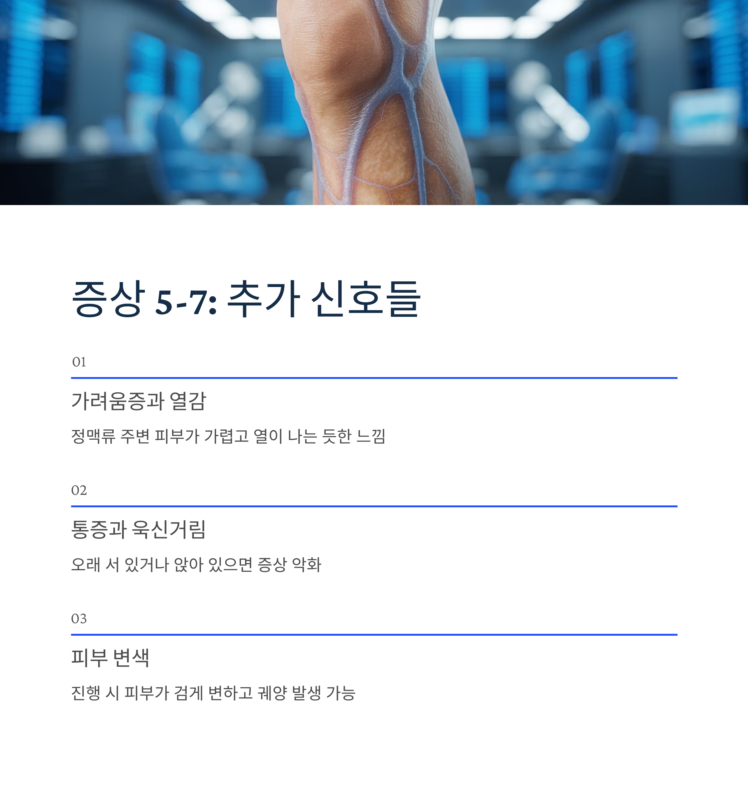 "왜 자꾸 다리가 무겁고 저릴까?" 혹시 이런 증상을 가볍게 넘기고 계신가요? 단순한 피로로 생각했던 다리 불편함이 사실은 하지정맥류의 초기 신호일 수 있습니다. 하지정맥류는 전체 성인의 30~60%가 경험하는 흔한 혈관 질환이지만, 방치하면 피부 변색과 궤양까지 이어질 수 있어 조기 발견이 무엇보다 중요합니다.